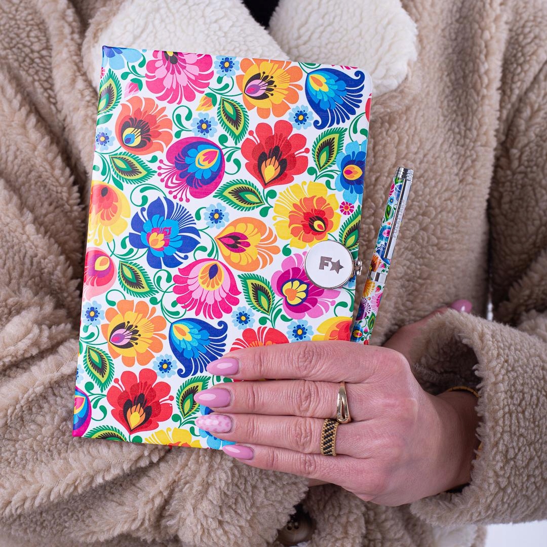 Елегантний блокнот + ручка, упакований в елегантну коробку. Натхненням для мотивів, що прикрашають предмети, є квіткові візерунки з вирізок з паперу Łowicz.