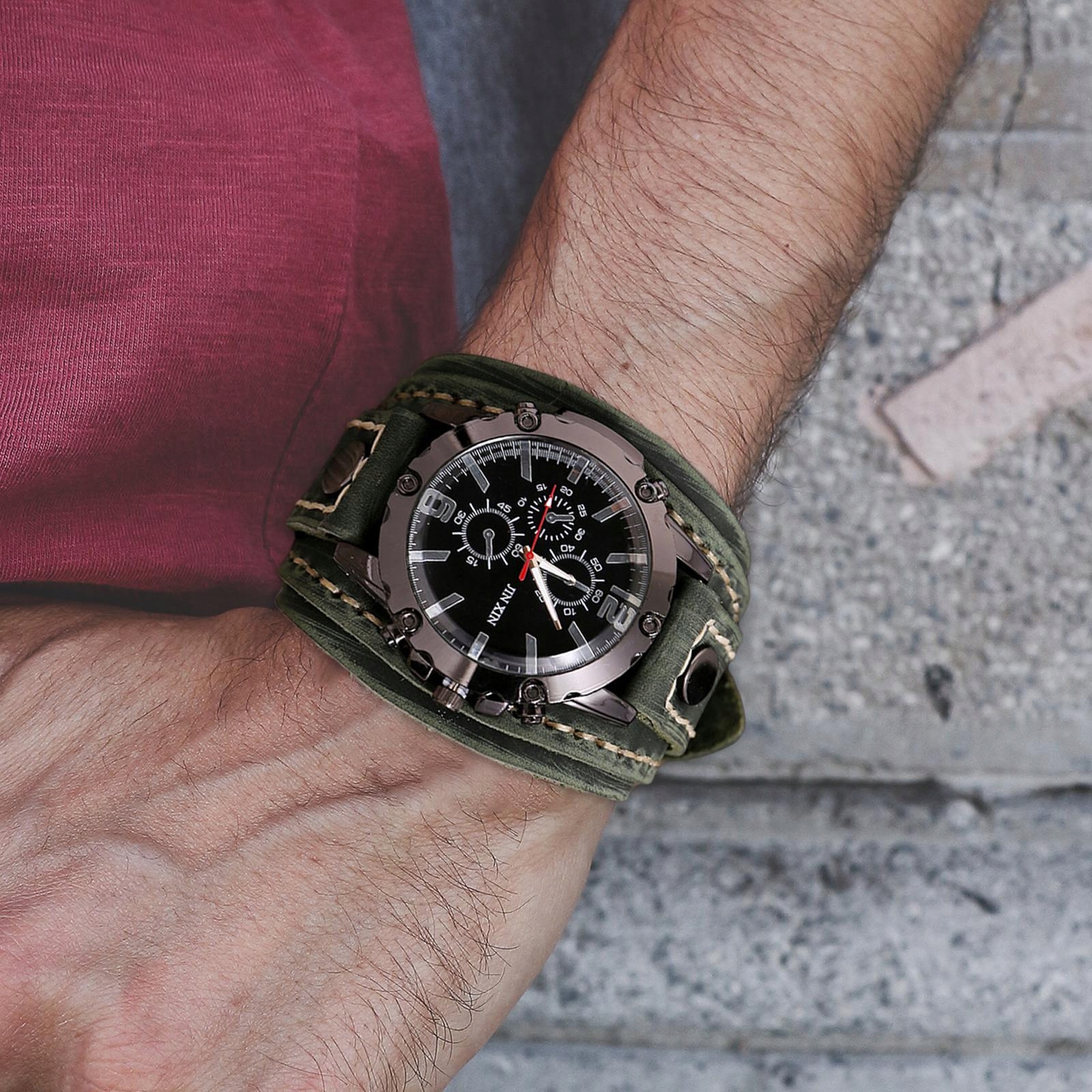 Матеріал: з широким шкіряним ремінцем із поліуретану, м’яким і гнучким, з отворами та еластичною пряжкою, що регулюється відповідно до вашого зап’ястка. Металевий корпус годинника та циферблат, міцні та високоякісні.