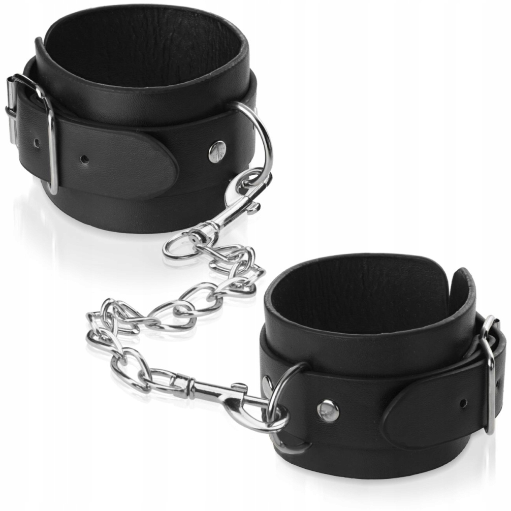 Шкіряні браслети з регульованим ремінцем і пряжкою. З'єднані між собою металевим ланцюгом. Завдяки міцній ручці вони гарантують, що ніхто не втече з рук добровільно. Ідеально підходить для любителів бондажу і кабального сексу. Вони дозволяють віддатися волі партнера або повністю контролювати еротичну ситуацію. Вони додають нестримної родзинки вашій чудовій грі.
