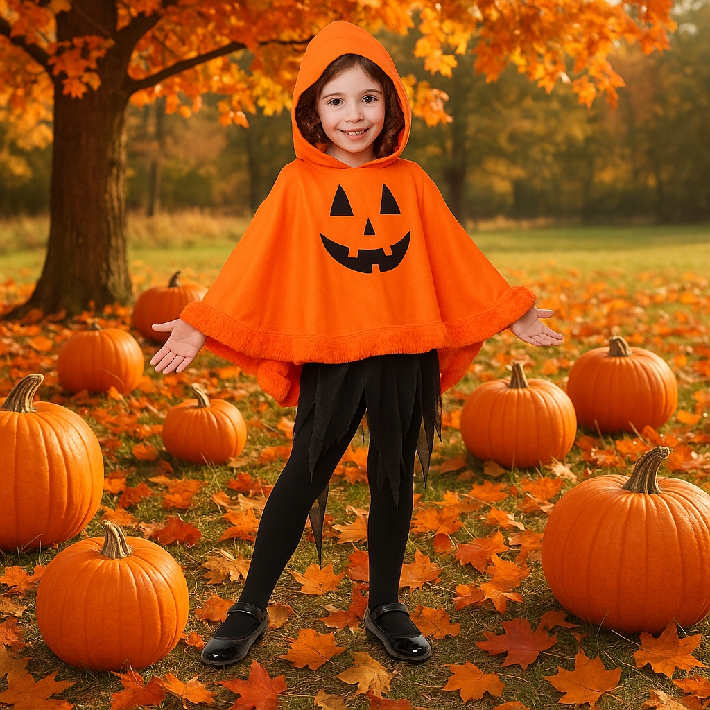 Вашій дитині сподобається чарівне пончо соковитого апельсина з мотивом гарбуза - символу Хеллоуїна! Це не просто костюм - це гарантія веселощів, радості та тепла в холодні дні. М'який матеріал приємно огортає, а вільний універсальний крій робить наряд зручним у носінні та адаптується до різних фігур.