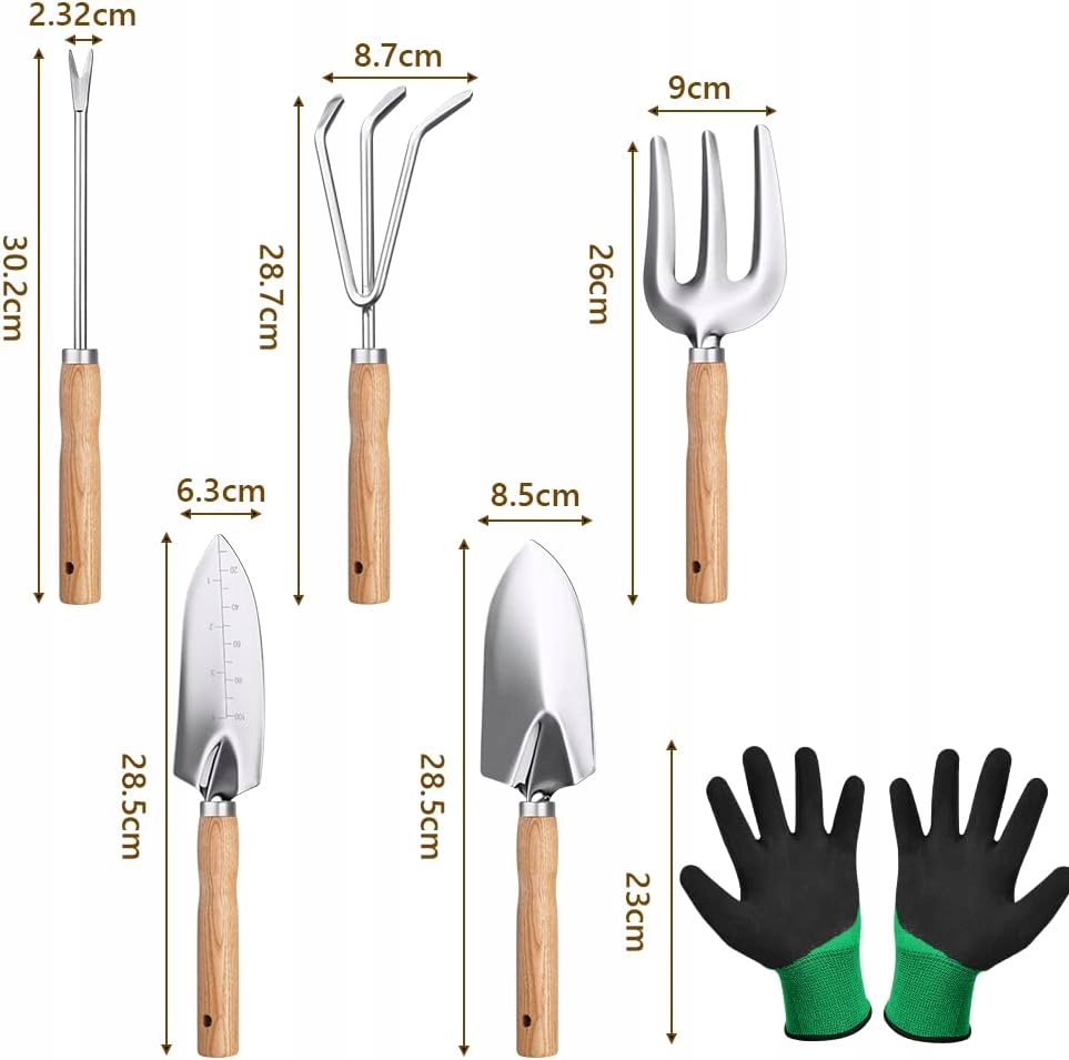 - Матеріал: садові інструменти виготовлені з протиковзкої деревини та стійкого до іржі алюмінієвого сплаву, міцні, легкі, міцні, блискучі, стійкі до іржі, міцні, небиткі і надзвичайно міцний. Цей потужний садовий інструмент досить міцний, щоб витримати найміцніші коріння, каміння та ґрунт.