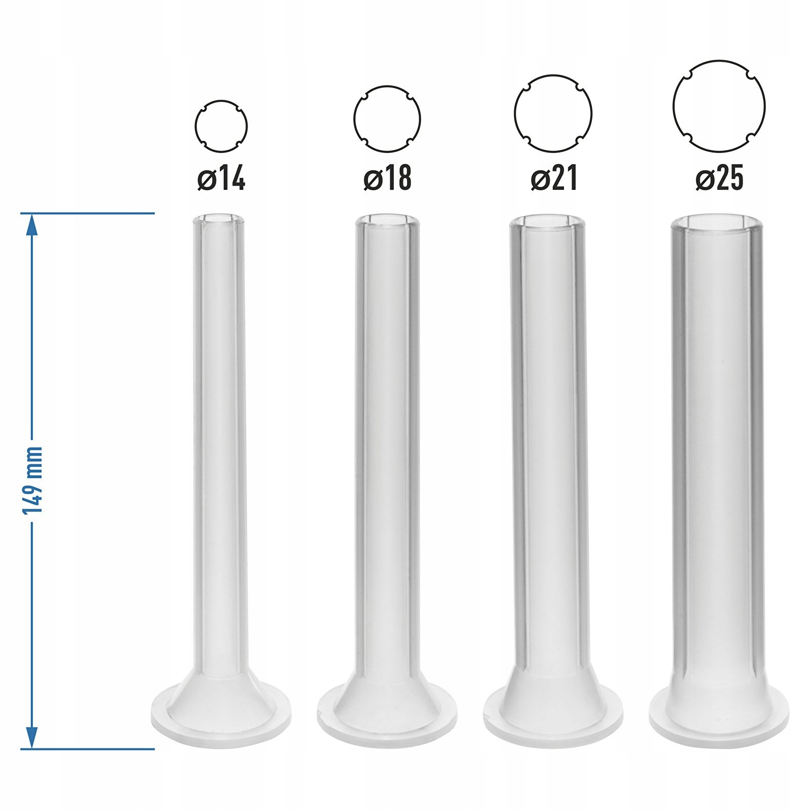 У набір входять 4 пластикові воронки різних розмірів - діаметри: 14, 18, 21 і 25 мм.