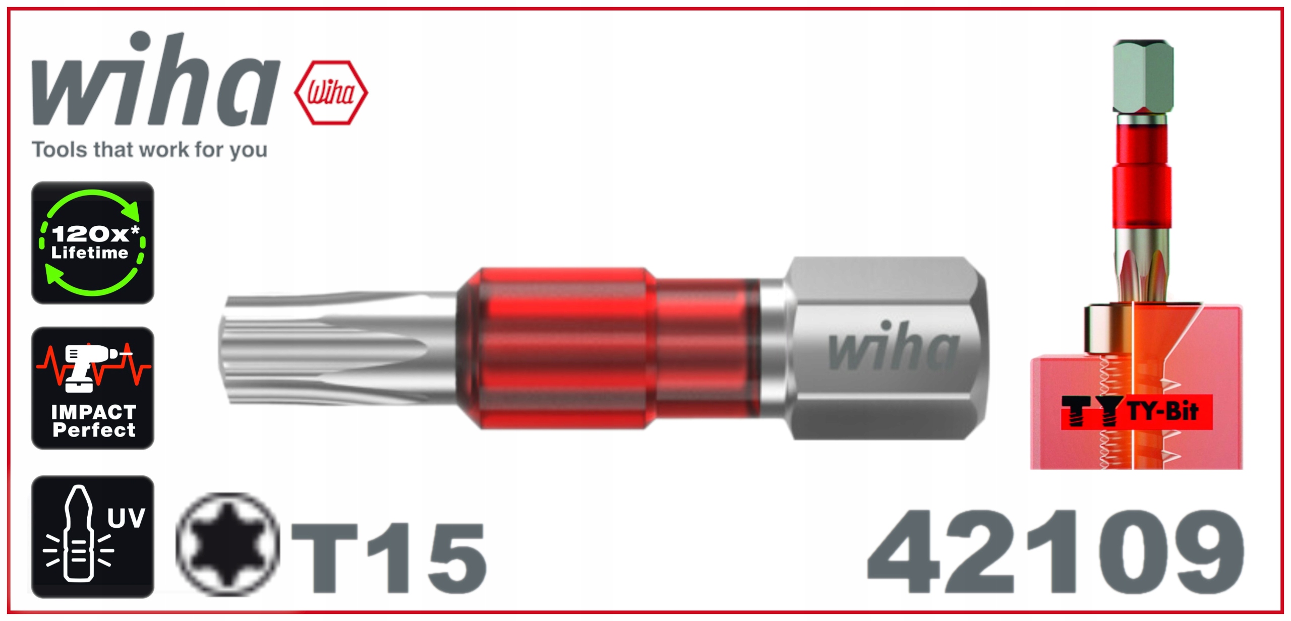 Напевно досі, купуючи насадки, ви задавалися питанням Завдяки революційній концепції насадки Wiha важлива лише форма головки гвинта, яка відіграє ключову роль у виборі. Універсальне рішення, тобто насадка "TY", підходить для всіх типів гвинтових головок, як Т-подібних, так і Y-подібних, і тому є ідеальним рішенням для гвинтових з'єднань з усіх матеріалів робить насадку придатною для ударних викруток, забезпечуючи в 120 разів довший термін служби в порівнянні зі стандартними насадками від Wiha, завдяки люмінесцентному лаковому покриттю ви можете швидко і легко знайти кольорові насадки навіть у темряві. Це зменшує кількість втрачених бітів і, таким чином, заощаджує непотрібні витрати.