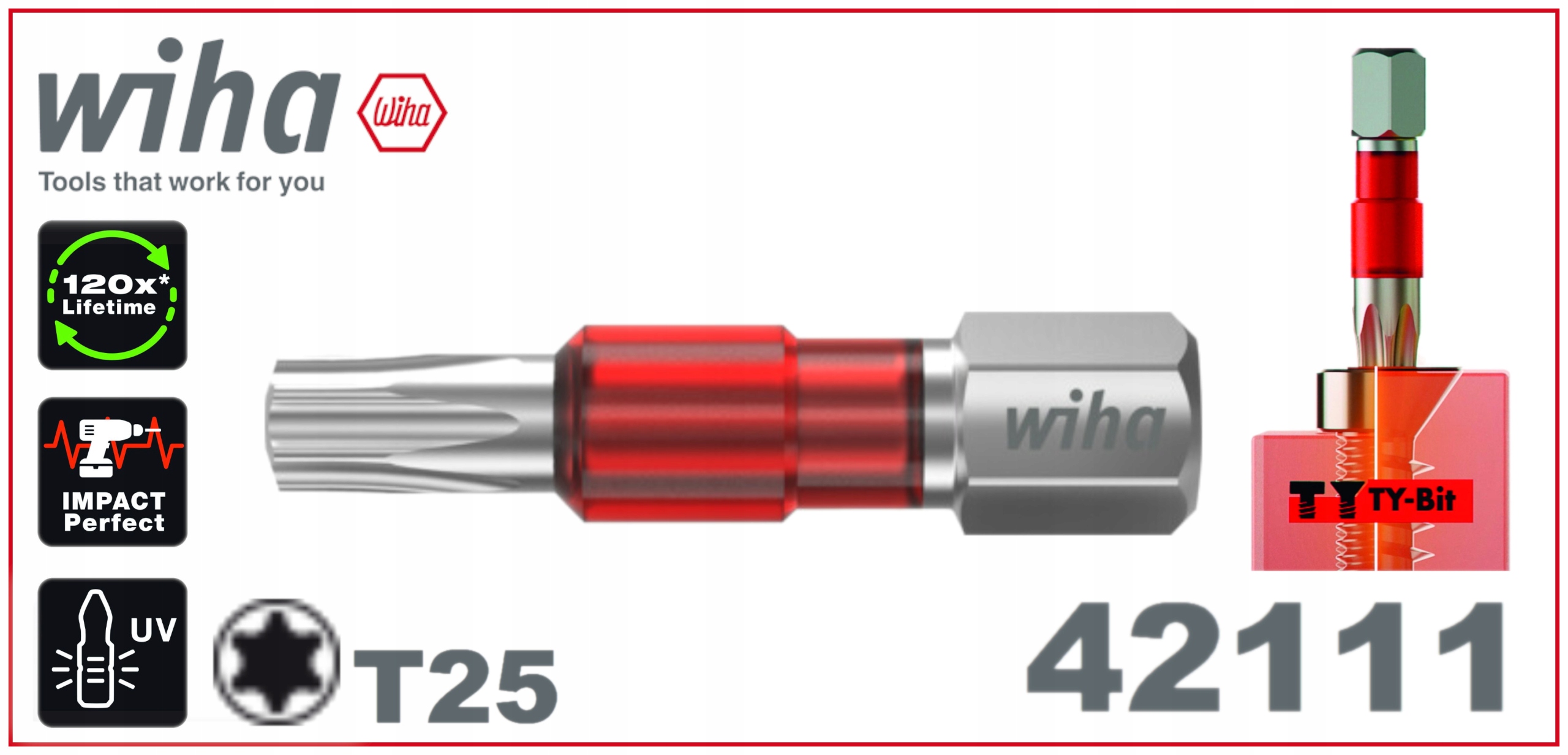 Напевно досі, купуючи насадки, ви задавалися питанням Завдяки революційній концепції насадки Wiha важлива лише форма головки гвинта, яка відіграє ключову роль у виборі. Універсальне рішення, тобто насадка "TY", підходить для всіх типів гвинтових головок, як Т-подібних, так і Y-подібних, і тому є ідеальним рішенням для гвинтових з'єднань з усіх матеріалів робить насадку придатною для ударних викруток, забезпечуючи в 120 разів довший термін служби в порівнянні зі стандартними насадками від Wiha, завдяки люмінесцентному лаковому покриттю ви можете швидко і легко знайти кольорові насадки навіть у темряві. Це зменшує кількість втрачених бітів і, таким чином, заощаджує непотрібні витрати.