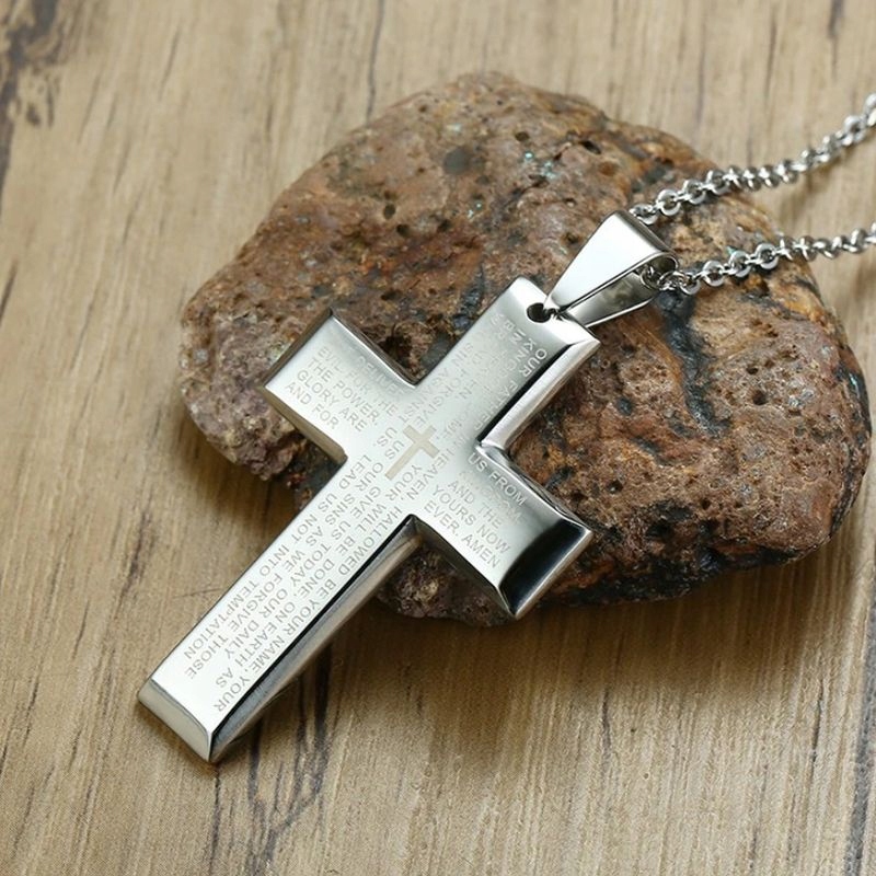 Ми пропонуємо вам елегантну підвіску, повністю виготовлену з високоякісної хірургічної сталі 316L, яку часто називають ювелірною, нержавіючої або благородною сталлю. Виріб у формі хреста виглядає дуже оригінально. Глянцевий кулон з молитвою «Отче наш» англійською мовою. Підвіска була створена з особливою увагою до деталей і неймовірною точністю, щоб максимально збільшити комфорт її використання. Він неодмінно припаде до смаку навіть вимогливим одержувачам і стане чудовим і вдалим подарунком для таких випадків, як: Святе Причастя, Конфірмація або як подарунок без приводу.