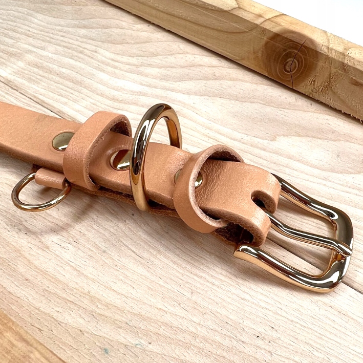 Застібка зкласичною нікельованою пряжкою золотого кольору дозволяє підтримувати підгонку під певний розмір. Крім того, він маєдва місця для кріплення повідця та спеціальнийгачок для адресної бирки.