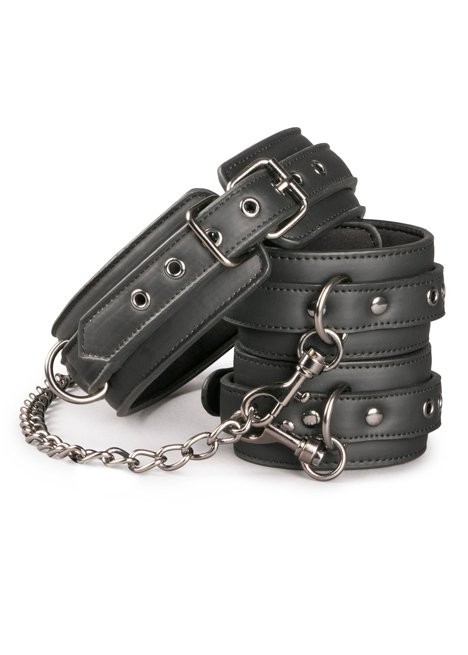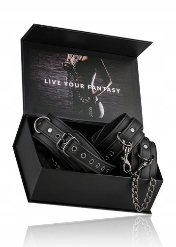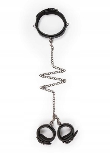 Ви контролюєте, коли ваш партнер носить цей фантастичний бондажний комплект! Він складається з горловини, з’єднаної з манжетами на щиколотках, які легко від’єднуються один від одного за допомогою пряжок. Вони виготовлені зі штучної шкіри, що надає їм розкішного вигляду. Як комір, так і манжети регулюються. Ви точно відчуєте захоплюючу та сексуальну гру SM із цим нашийником.