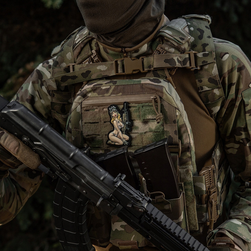 Натхненний американською культурою пін-ап Другої світової війни, бренд M-Tac продовжує серію нашивок Tactical Girl ще однією красунею. Харизматична і надзвичайно приваблива, кокетлива і в той же час ризикована дівчина Pin-Up випромінює красу і силу характеру. За її чарівністю ховається сталева рішучість, а кулемет М249 у її руках виражає готовність до бою в будь-який момент.