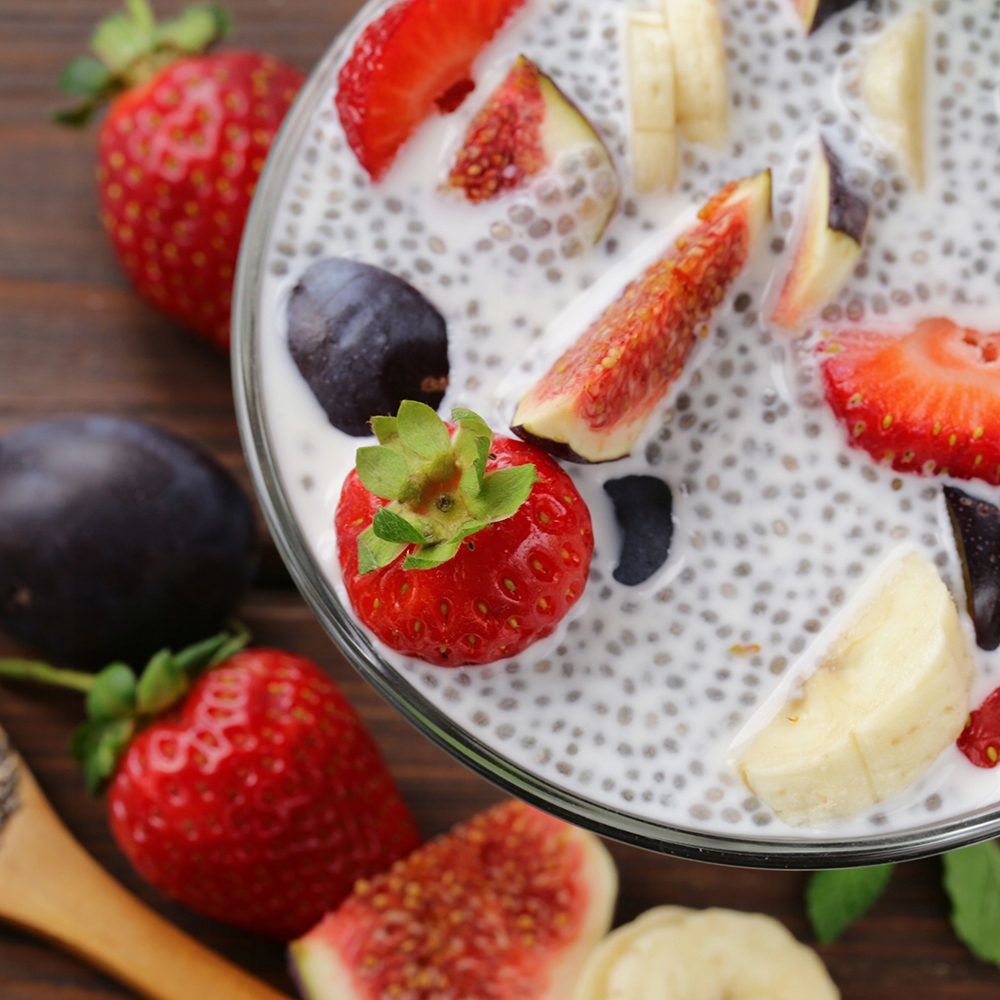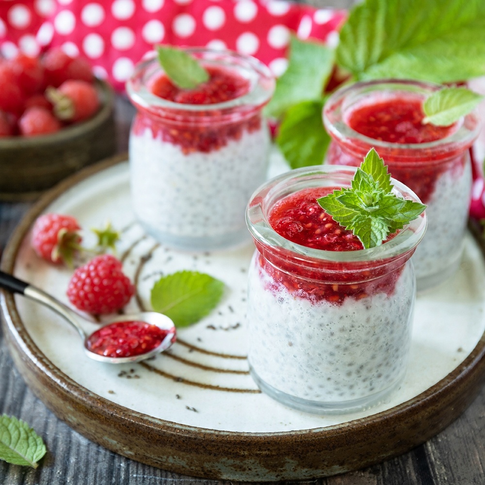 Чіа-пудинг: насіння чіа мають здатність поглинати рідину й утворювати гель, що робить їх ідеальними для приготування здорового чіа-пудингу. Просто змішайте насіння чіа з рослинним молоком або йогуртом, додайте трохи підсолоджувача та улюблені фрукти, а потім залиште на кілька годин або на ніч у холодильнику, щоб отримати консистенцію пудингу.