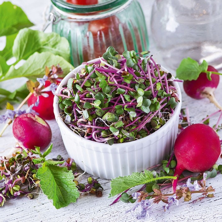 Паростки редьки, завдяки великій кількості вітаміну С (містять вітаміну С вдвічі більше, ніж коренеплоди редьки), підвищують імунітет організму. Це чудовий засіб від застуди, а також має відхаркувальний ефект. Високий вміст сірки в паростках редьки позитивно впливає на стан шкіри, волосся і нігтів. Паростки редьки мають гострий, перцевий, характерний смак, майже ідентичний коренеплоду редьки. Їх додають в салати, бутерброди, сир, яйця і подрібнюють в супи. В упаковці 20 г насіння.