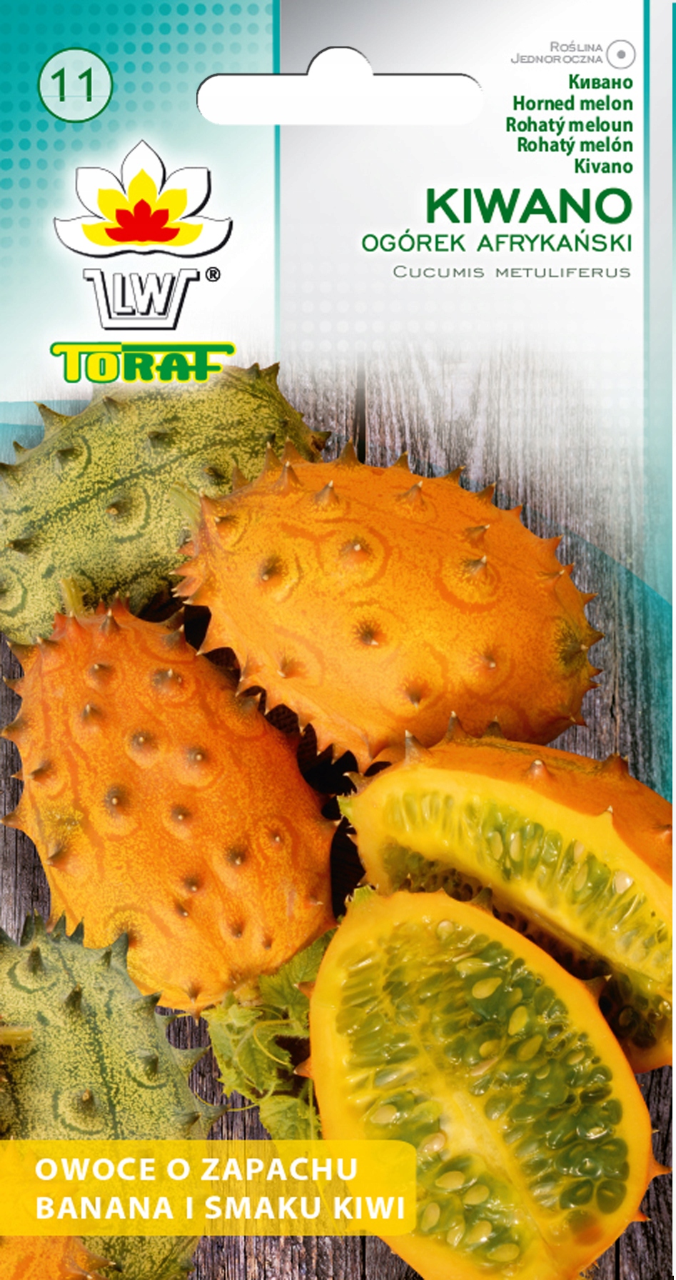 Ківано — однорічна ліана з дрібними жовто-оранжевими квітками. Колючі декоративні плоди в середньому важать 200-300г. М'якоть з запахом банана і смаком ківі смачна і соковита, з великою кількістю їстівних кісточок. Ківано можна їсти сирим або додавати в напої, салати чи десерти. Посів під укриття на глибину. 1 см III-IV або безпосередньо в землю після 15 В.