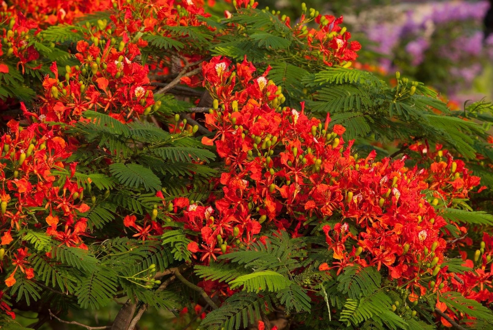 Дерево, яке в природних умовах утворює розлогу зонтикоподібну крону. Висота до 9м, ширина від 5 до 10м. Листя темно-зелені, довгі, двічі перисті. Цвіте з весни до літа. Квітки значні, 10 см, червоно-червоні.