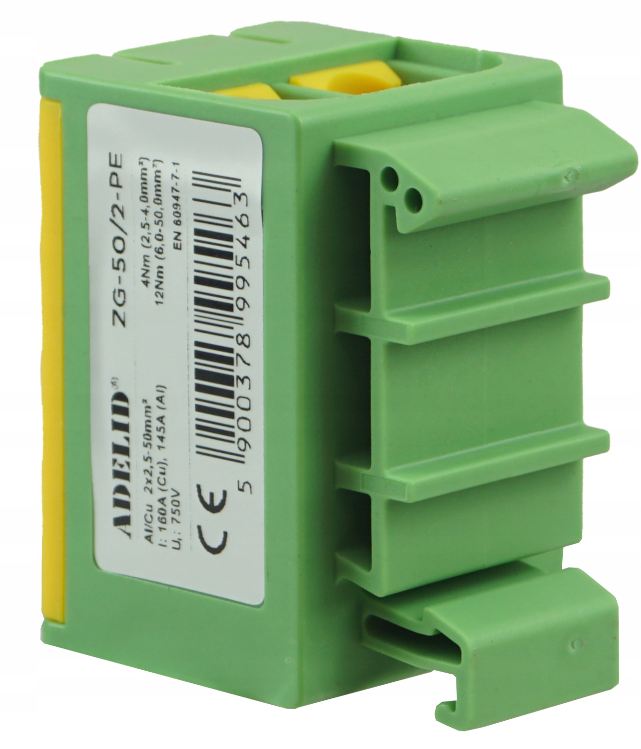 НАСКРІЗНИЙ З'ЄДНЮВАЧ НА РЕЙКУ ДВІЙНИЙ ЗАЖИМ РЕЙКА ЖОВТИЙ ЗЕЛЕНИЙ 4x2,5-50 мм2