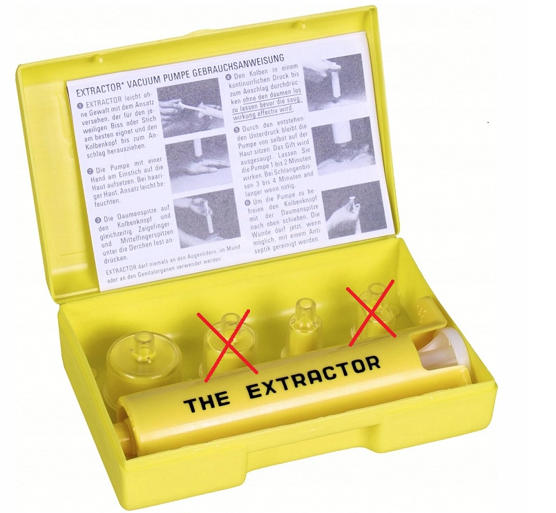 ⬜ Extraktor -це мініатюрний відсмоктувальний насос , що виробляє вакуум близько 0,75 атм за місцем використання, і, таким чином, безболісно і неінвазивно видаляє всі отрути та токсини . Незалежно від основної функції всмоктувальних токсинів, він має додатковий ефект. Розроблений вакуум призупиняє кровообіг у локальній капілярній мережі, і, таким чином, запобігає подальшому розповсюдженню токсинів у тілі. /Ul>