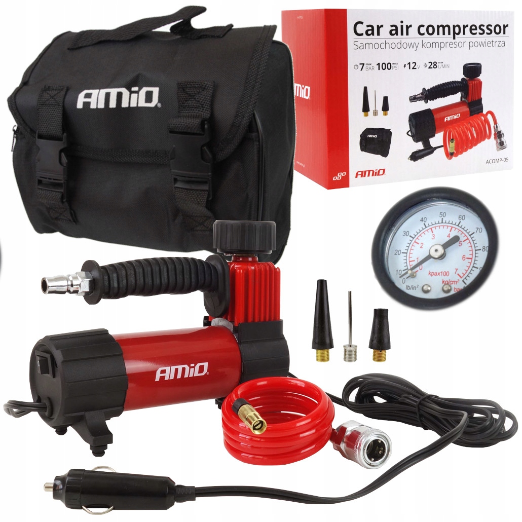 Ми пропонуємо надійний, добре зроблений, мініатюрний компресор. Максимальний тиск, який він може створити, становить7 БАР / 100 PSI. Враховуючи розміри, має велику відстань від наконечника насоса до розетки 12В, до 4 метрів (довжина кабелю - 3м, довжина шланга - 1м). Завдяки широкому обладнанню ви зможете легко накачати не тільки свій автомобіль, мотоцикл, велосипед, а й матраци, м’ячі, надувні іграшки тощо.