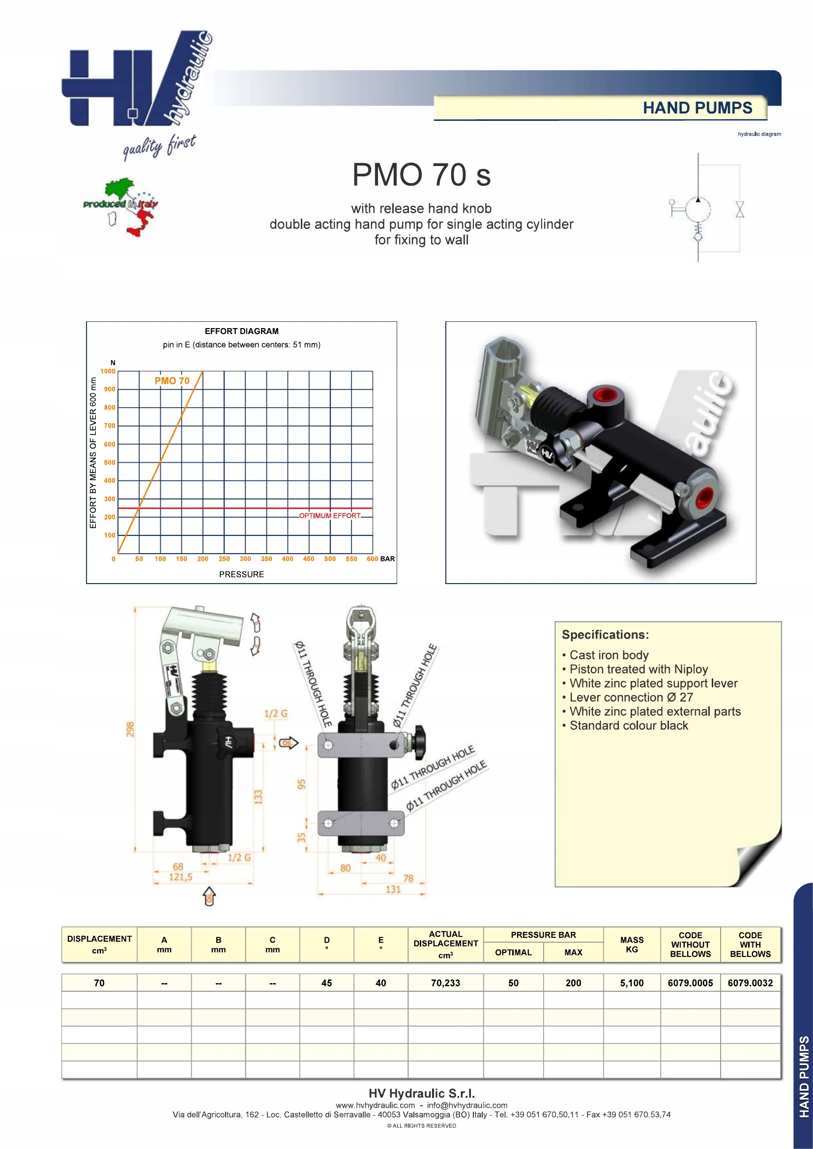 Ручний насос без резервуара для циліндра односторонньої дії 70 см3 200 бар з ручкою розвантаження PMO 70s (6079.0032) + важіль
