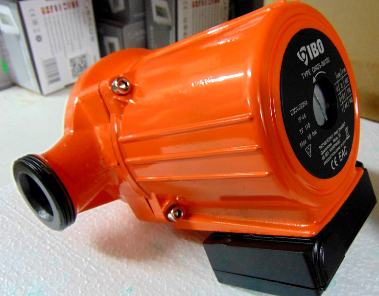 Великий насос для живлення системи центрального опалення. Насос із т.зв мокрий ротор Працює дуже тихо. В основному використовується на великих і великих будівельних об’єктах, а також там, де потрібна більша кількість потоку води з високим опором в установці