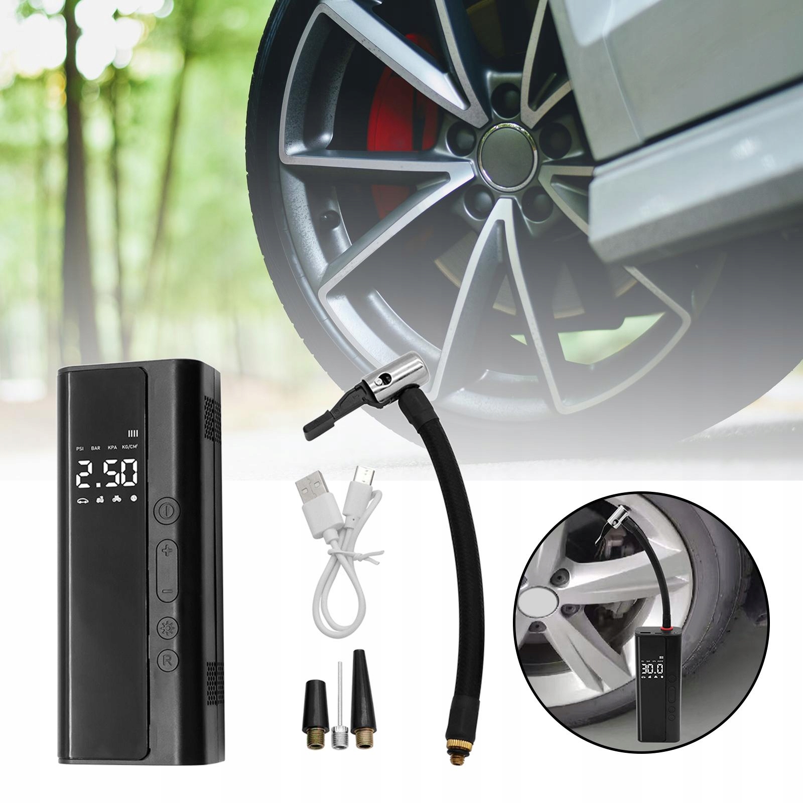 [Багатофункціональний]: портативний повітряний компресор може використовуватися як надувний, освітлювальний або живлення. 4