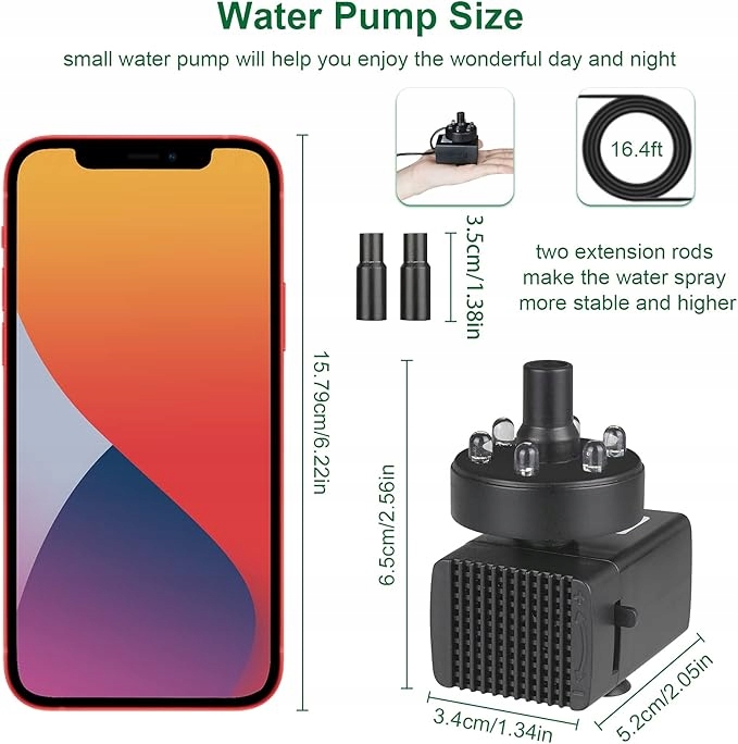 - комфортна та безпечна : 5,2 х 3,4 х 6,5 см, це дуже маленький і компактний фонтан для пташиних ванн; Шнур живлення має довжину 16,4 дюйма, що дуже добре підходить для встановлення на великі відстані і оснащений двома стрижнями, що простягають насадку довжиною 3,5 см, завдяки якому спрей є більш стійким і вище; 4