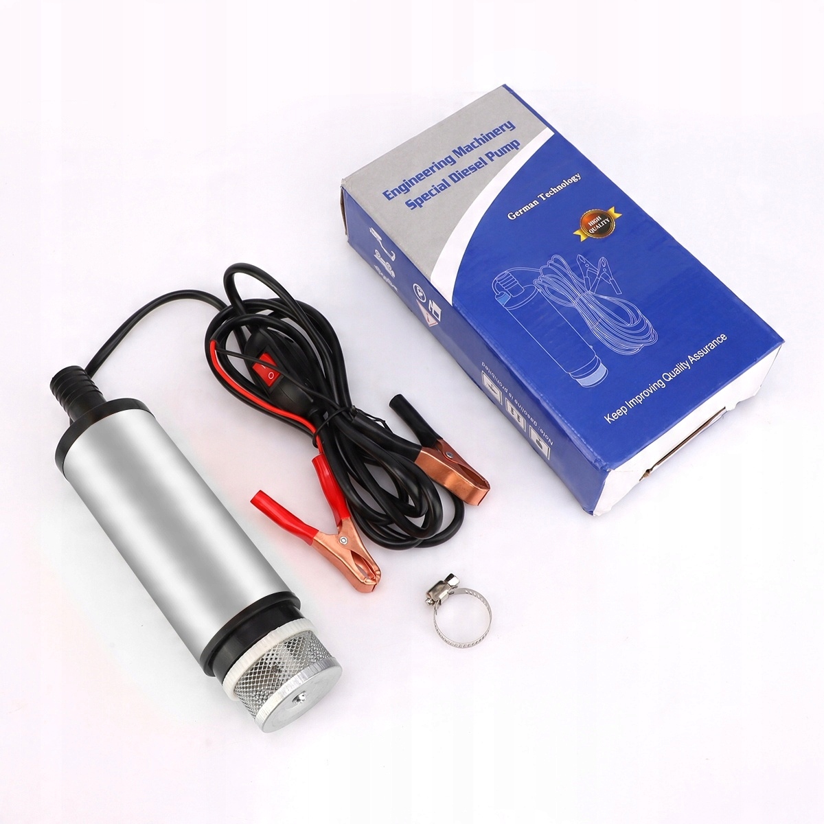 Алюмінієвий корпус, довгий кабель живлення довжиною 2,3 метри (з 2 затискачами типу «крокодил») забезпечує зручне встановлення та використання (допустима похибка напруги ±5%, зверніть увагу на позитивний і негативний полюси). Металевий фільтр утримує бруд і не іржавіє, а знімний гвинтовий адаптер дозволяє легко чистити фільтр.