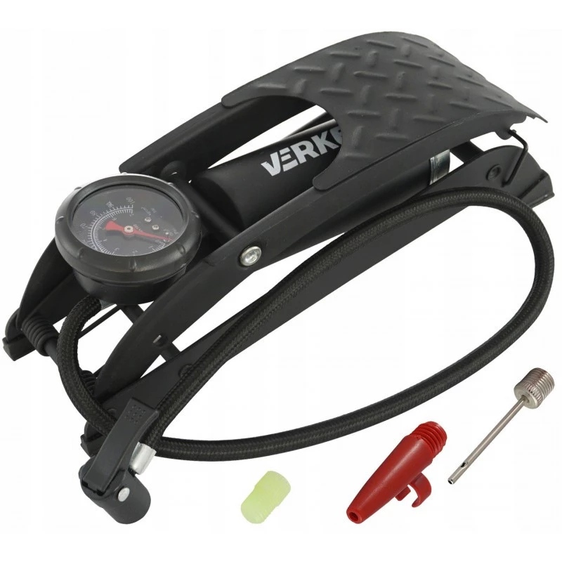 Верке -одиночний насос для ніг. Насос з твердою конструкцією, виготовленою з пресованої, лаврового листа з товщиною 3 мм. Педаль повністю покритий гумою для кращого зчеплення. Прозорий манометр, що показує в смугах (0-7) та PSI (0-100). Міцний і гнучкий шланг. Включені два адаптери. Ідеально підходить для професійних послуг та домогосподарств.