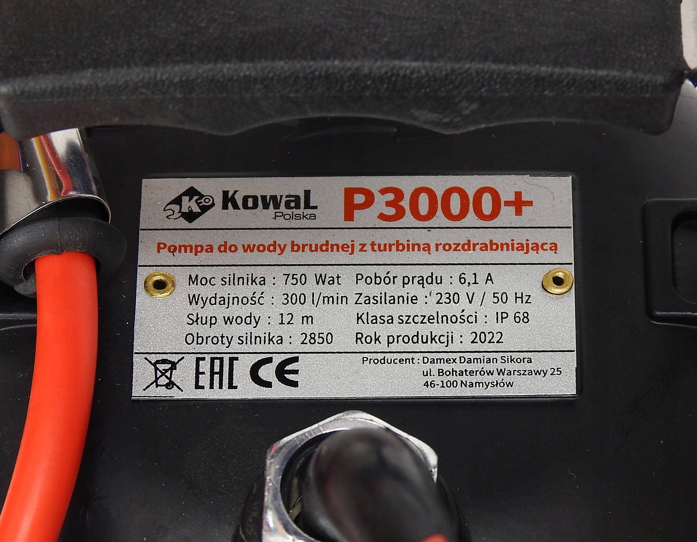 KowaL P3000+ з подрібнювачем — це насос, що працює від однофазного (230В) двигуна. Робота двигуна потужністю 750 Вт дозволяє піднімати воду на висоту 12 м, або горизонтальну відстань понад 200 м. > Максимальна продуктивність насоса становить 300 л/хв, але це в основному залежить від довжини та діаметра шлангів. Насос є повністю герметичним і повинен працювати повністю зануреним, щоб забезпечити найкраще охолодження двигуна. Насос оснащений контрольним поплавком, завдяки якому немає ризику роботи всухую (поплавок опускається після закінчення роботи і вимикає пристрій). Насос був адаптований для роботи з гнучкими шлангами, жорсткими шлангами та пожежними шлангами завдяки відповідним з’єднувальним кінцям діаметром 2" (52 мм), 1,5" (38 мм), 1" (25 мм) і швидкоз’єднувальний пристрій пожежної охорониb>. Також можливе пригвинчування трубопроводу безпосередньо до вихідного отвору насоса (класична різьба 2 дюйми). Насос має чавунне робоче колесо та чавунний корпус крильчатки, що подовжує термін його служби, забезпечує стійкість до хімічної корозії та дозволяє працювати в несприятливих умовах. .Моторний відсік герметизований набором керамо-графітових герметиків в масляній ванні.Це рішення дозволяє довгостроково інтенсивно використовувати без побоювання протікання двигуна.Додаткове оснащення пристрою -термічний захист встановлений безпосередньо на обмотці двигуна, що захищає двигун від перегріву.Безперечною перевагою пристрою є низький рівень шуму під час його роботи, що досягається завдяки ретельно підібраним конструкційним матеріалам.Крім того, насос простий у встановленні та використанні.
