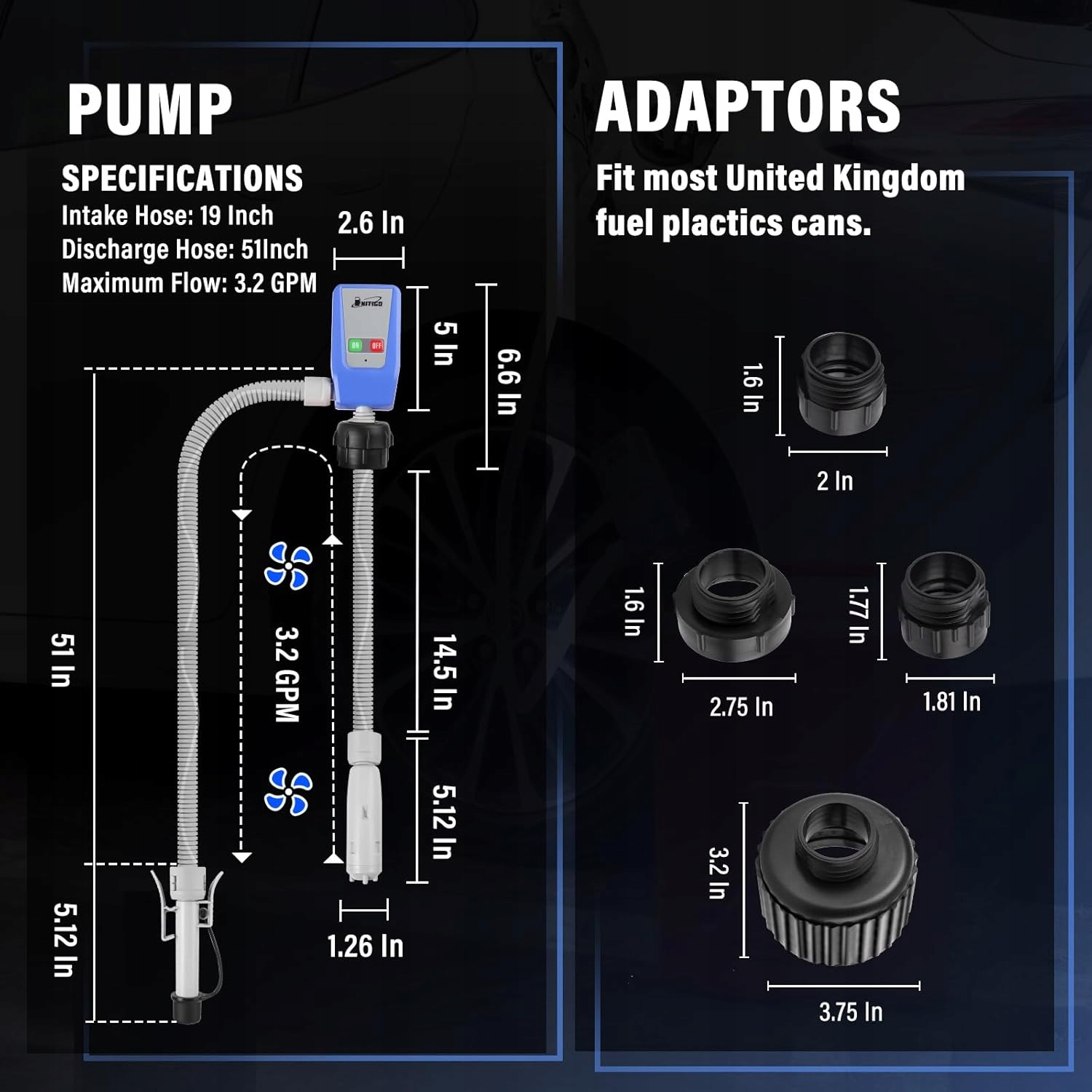- Адаптери: 4 універсальні насадки, встановлені на каністрах і резервуарах (наприклад, 50 мм / 52,5 мм / 70 мм / 93 мм)