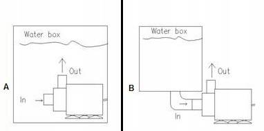Насос завжди повинен бути встановлений нижче рівня води. Найчастіше насос просто занурюють у резервуар для води (не забувши додати до входу фільтр, наприклад сітку), як у прикладі A.