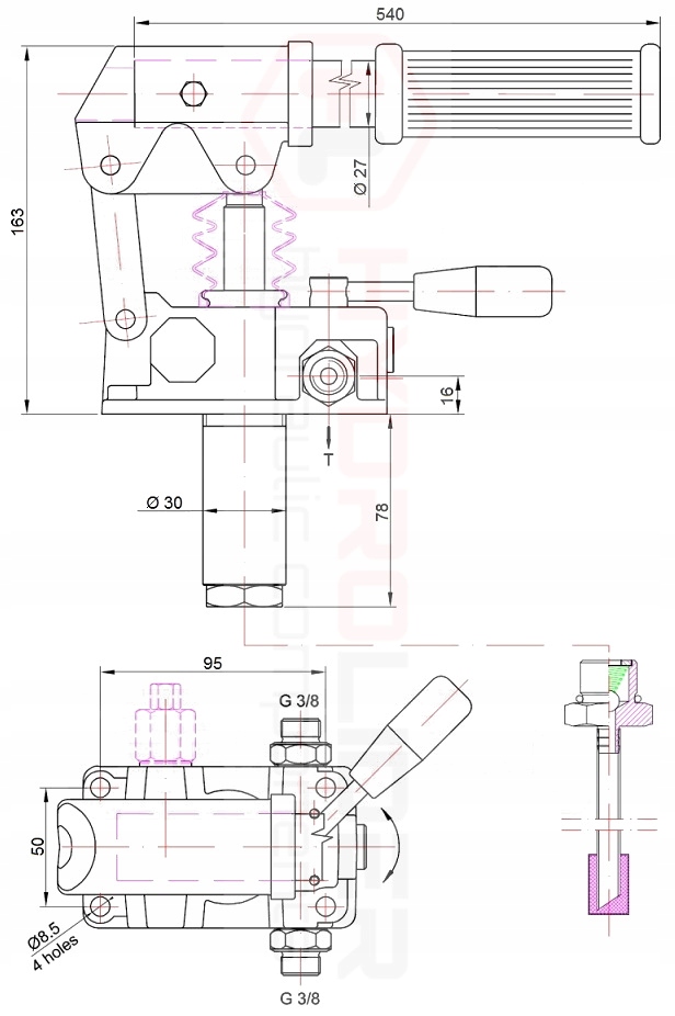 З насоса виходять два масляні роз’єми (на фото дві червоні кришки), що дозволяє підключити привод подвійної дії. Насос відмінно працює з усіма двосторонніми приводами Badestnost з нашої пропозиції.