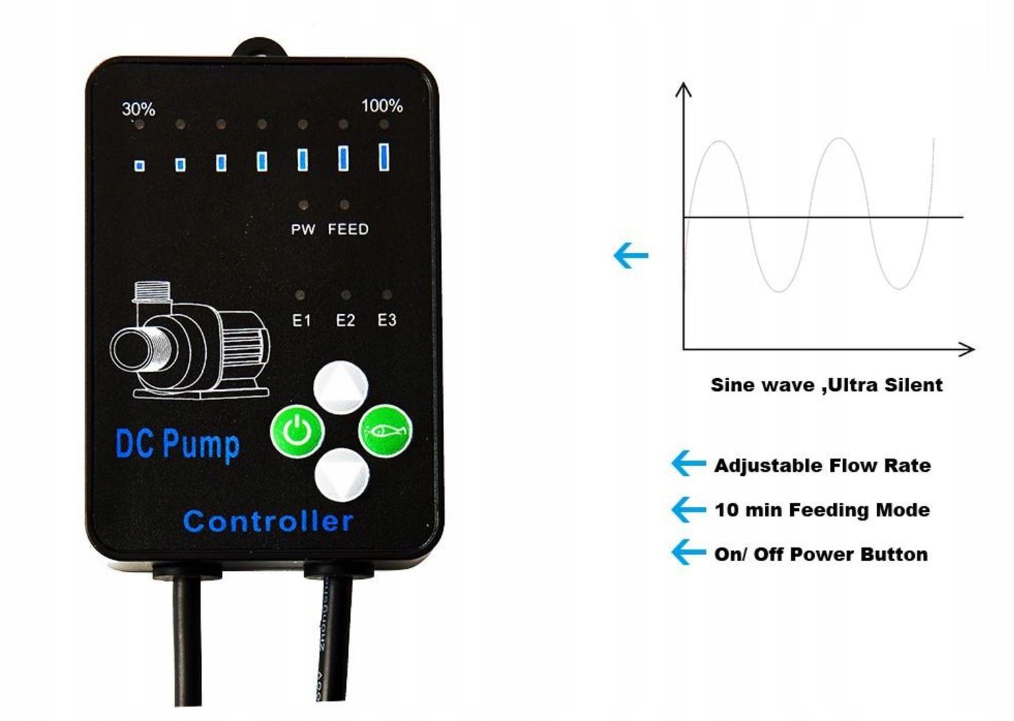 Кожен насос SWD має дуже чіткий і простий у використанні контролер. Завдяки цьому пристрою ви можете плавно керувати потужністю насоса від 30% до 100% потужності, увімкнути/вимкнути насос або встановити 10 -хвилинну перерву для подачі.