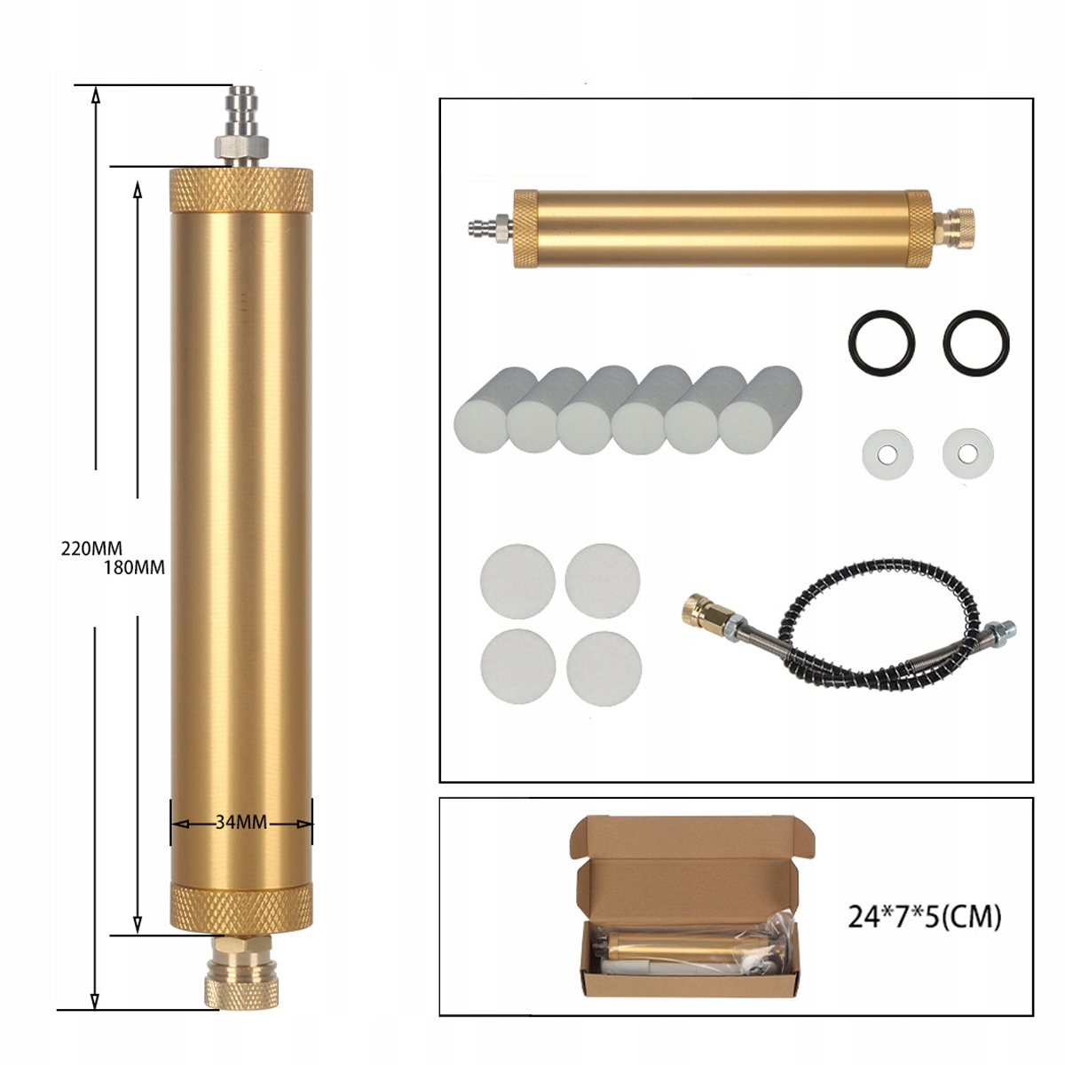 Комплект водовіддільника виготовлений із високоякісної безшовної алюмінієвої труби 6061, має високу твердість, стійкість до зношування та корозії, тривалий термін служби, надійний та довговічний, фільтруючий елемент виготовлений із стрижнів з бавовняного волокна та осушувача.