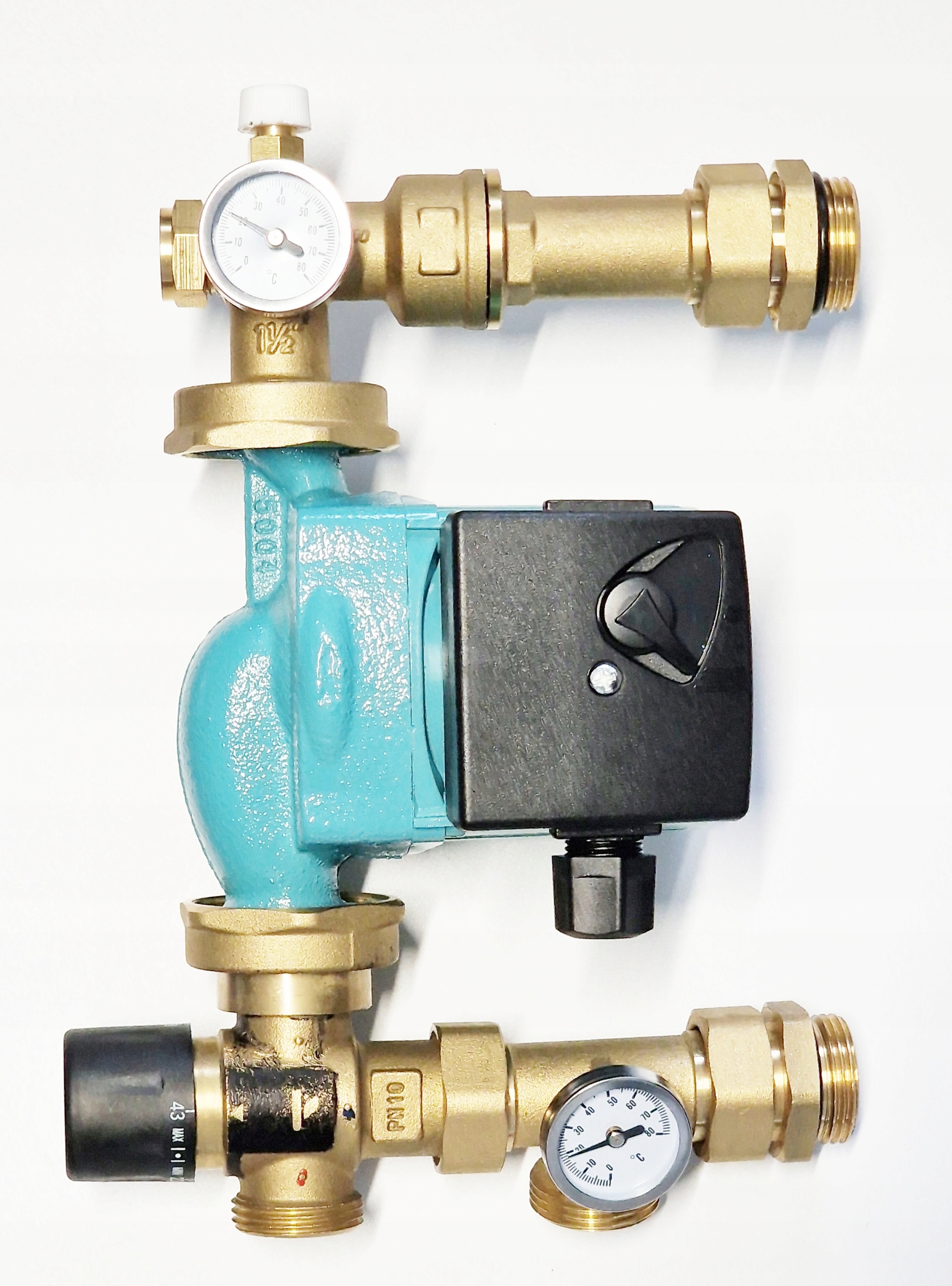 Група оснащена термостатичним вентилем, який після встановлення потрібної температури подає її в колектор (установку) відповідно до налаштування вентиля. Захищає систему від надмірної температури.