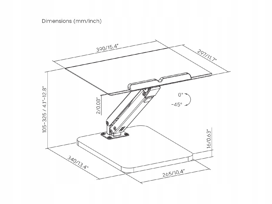 - Нахил стільниці регулювання: від 0 до 325 мм -45°