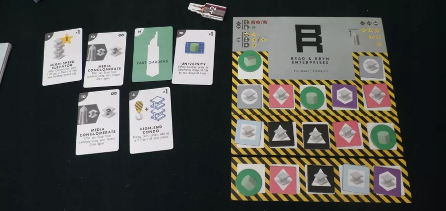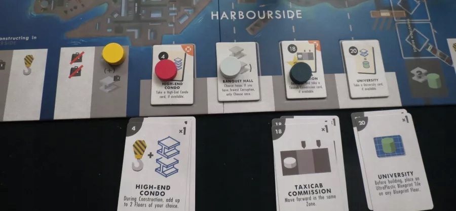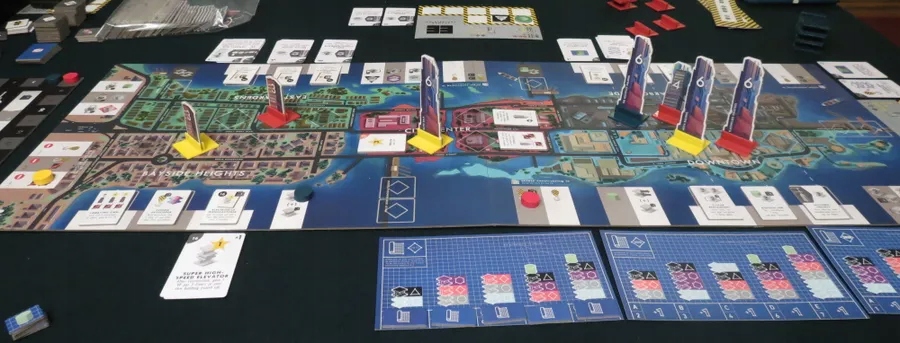 Ви виконуватимете всі свої дії, наприклад збирати ресурси, будувати будівлі та віддавати послуги, в один бік. Як і в інших іграх з односторонньою трасою, ви можете йти так далеко, як вам заманеться, але ви отримаєте ще один поворот лише тоді, коли всі інші пройдуть вас. Ви отримуєте 1 VP на поверх за кожну побудовану вами будівлю. Орендарі пропонують потужні дії, які змінюють кожну гру. Ви можете отримати силу орендаря, приземлившись на його простір або побудувавши будівлю на його картці.