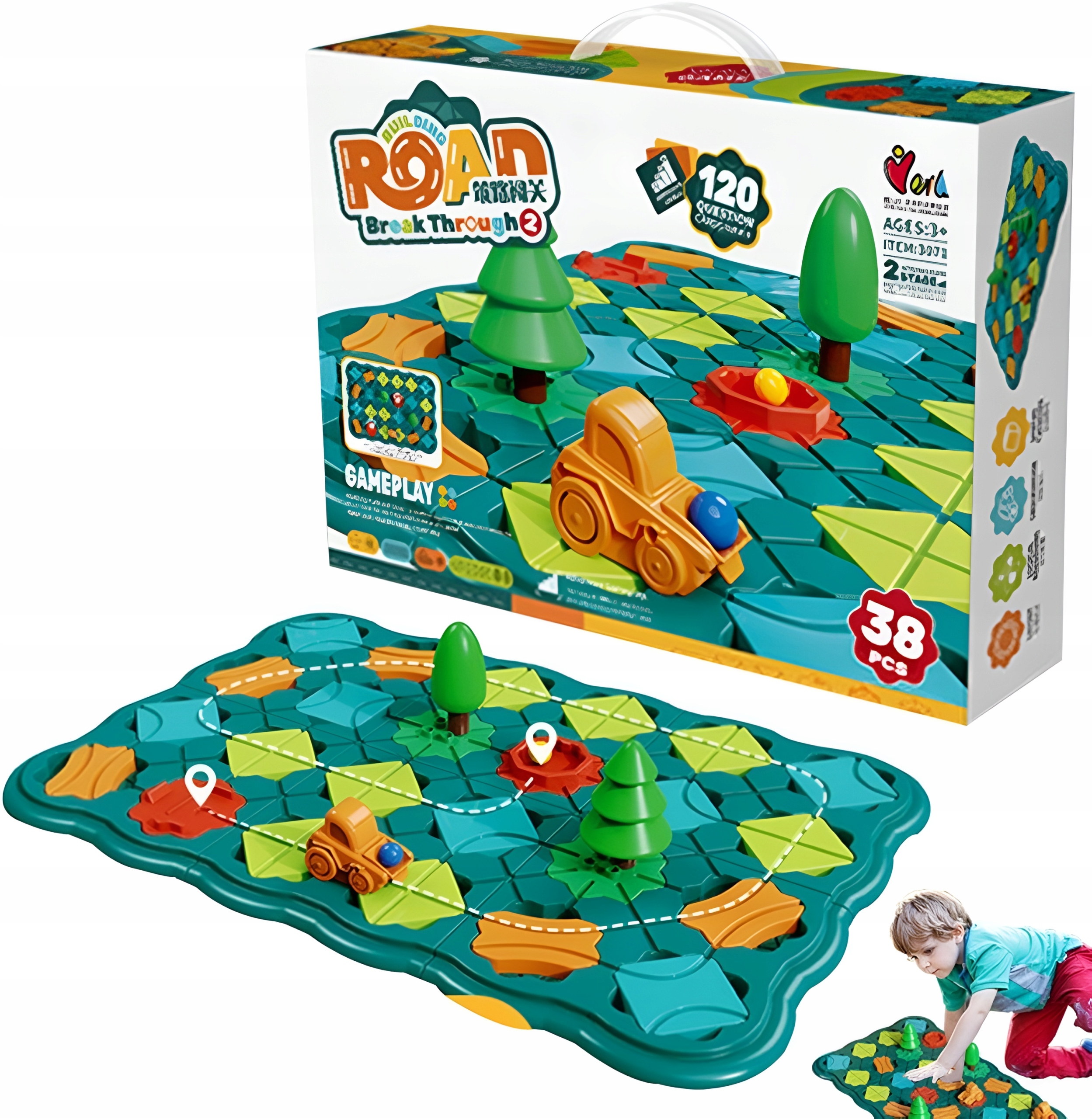 ✔️ 38 елементів набору, включаючи плитки з дорогами, поворотами, перешкодами, деревами та транспортним засобом