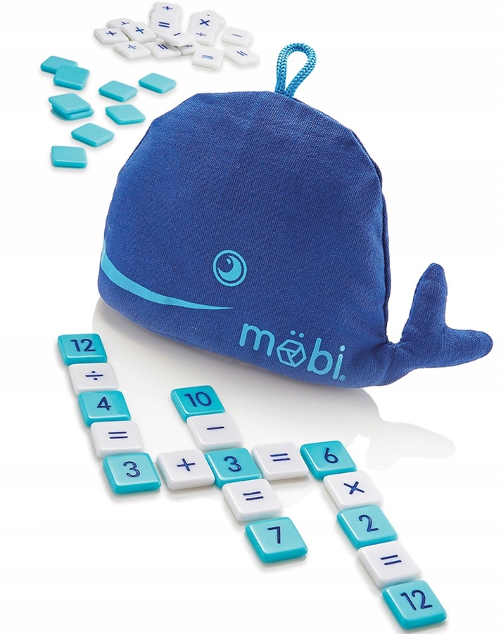 Mobi, упакований у тканинний мішечок із застібкою у формі кита, — це швидка, захоплююча та портативна гра на рахунок, множення, додавання, віднімання та ділення. що він сподобається всій родині.