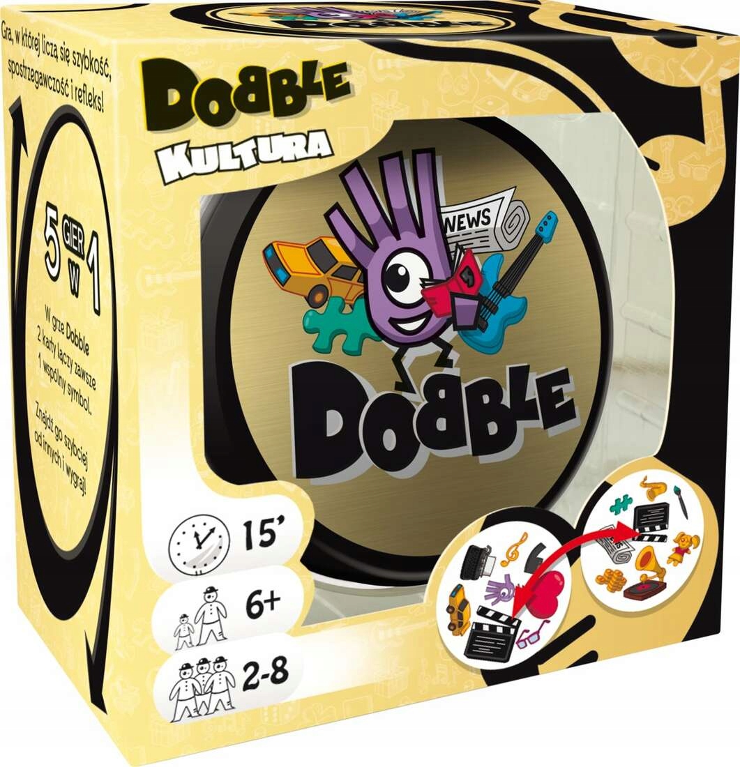 dobble kultura - це соціальна гра, яку ви можете взяти з собою всюди і грати за короткий час. Більше того - у нього є п’ять варіантів змагань, завдяки якому він, безумовно, не буде нудно довго. Враховується швидкість, сприйнятливість та рефлекси.