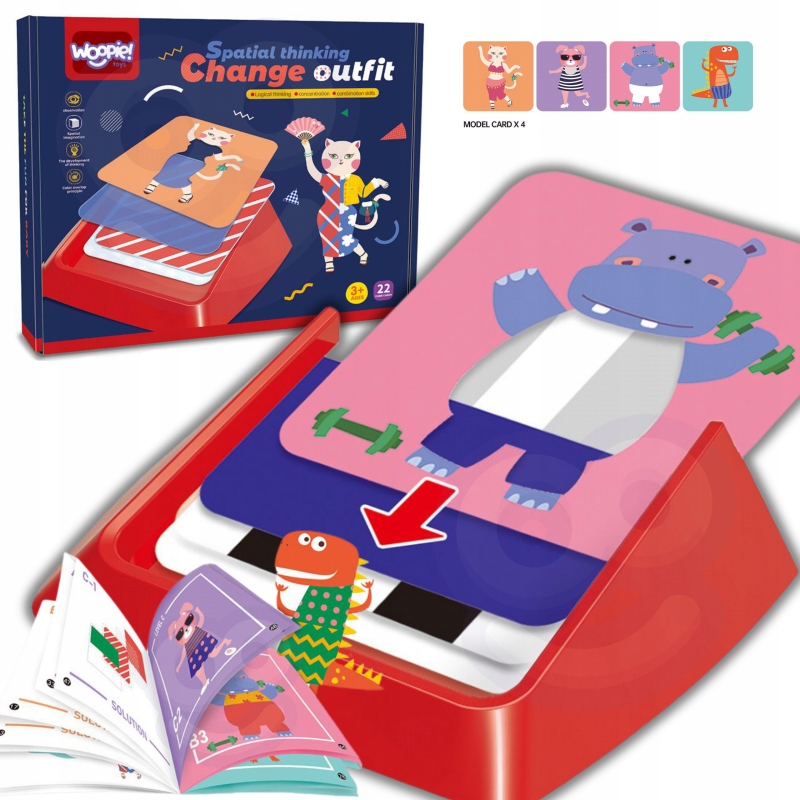 Change Outfit — гра-головоломка від бренду Woopie. Розвиваюча іграшка розвиває логіку, творчі здібності та колірне сприйняття. Комплект містить 48 завдань 3 рівнів складності. Виберіть шаблон завдання, вашою моделлю може бути кіт, бегемот, кролик або дракончик. У завданні оцініть кольори та одяг моделі. Виберіть потрібні картки з візерунками та розмістіть їх у правильному порядку на стійці. Наряд вашої моделі повинен точно відповідати тому, що було зазначено в завданні. Почніть з легкого рівня і переходьте до наступного. Пройшовши останній рівень, вас точно можна буде назвати експертом у світі моди. Настільна гра Change Outfit допоможе вам створити чудове модне шоу.