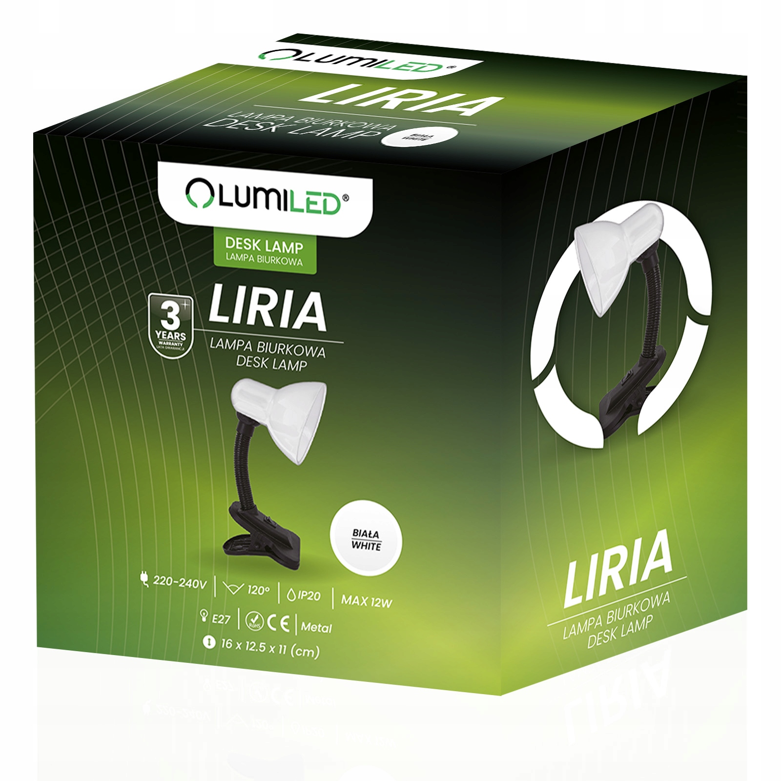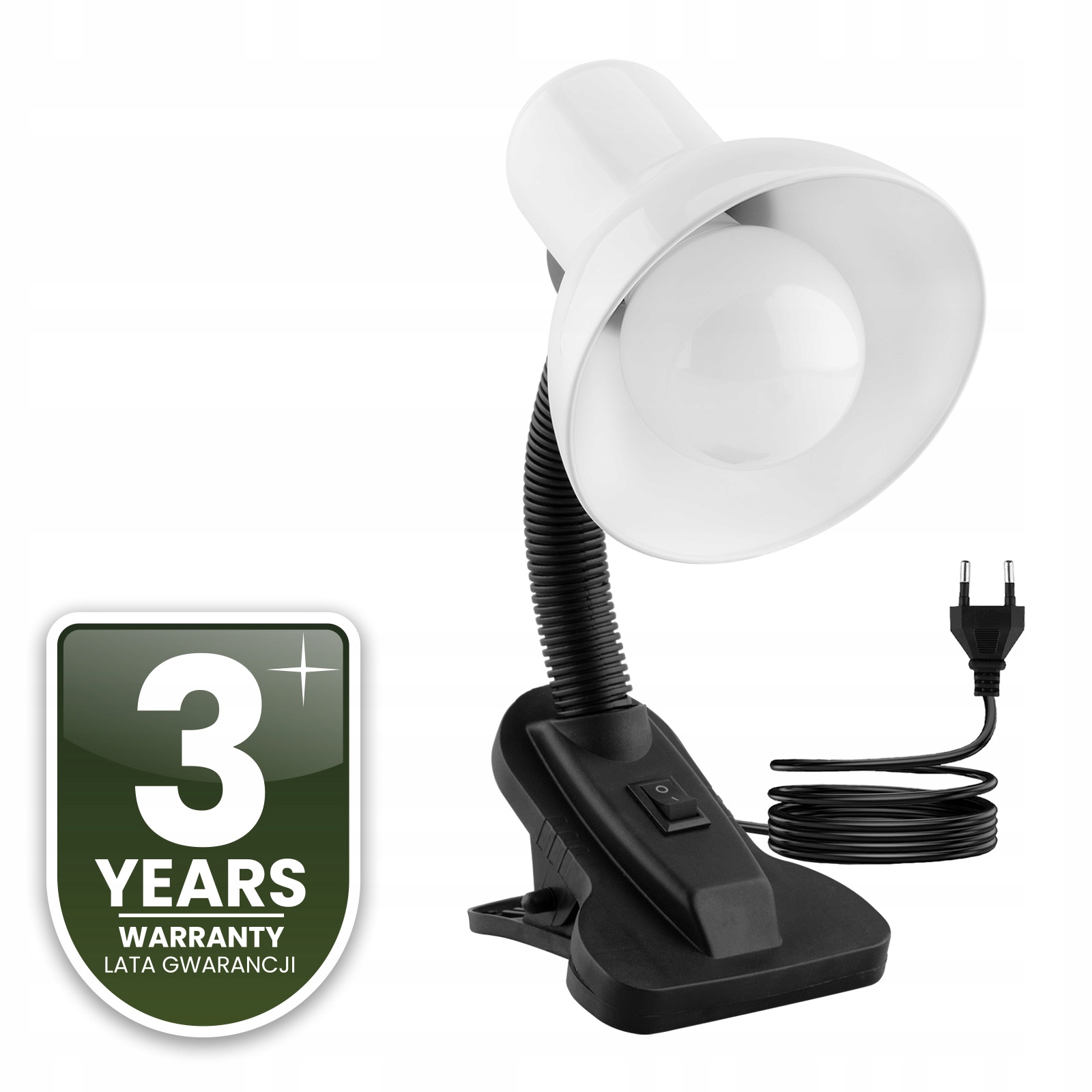 Біла настільна лампа з абажуром 11 см в діаметрі - ідеальний продукт для щоденного використання у вашому домі. Регульований кронштейн дозволяє регулювати напрямок світла відповідно до індивідуальних потреб користувача. Він дозволяє нам краще освітлювати робочу зону, вчитися за письмовим столом або служити нічником у дитячій кімнаті. Крім того, він оснащений спеціальним затискачем, який дозволяє легко прикріпити його до краю стільниці або полиці, що економить місце на столі та дозволяє точно розташувати джерело світла. Затискач на кінці лампи забезпечує стабільне кріплення, що робить її ідеальною для роботи, читання чи інших точних завдань.
