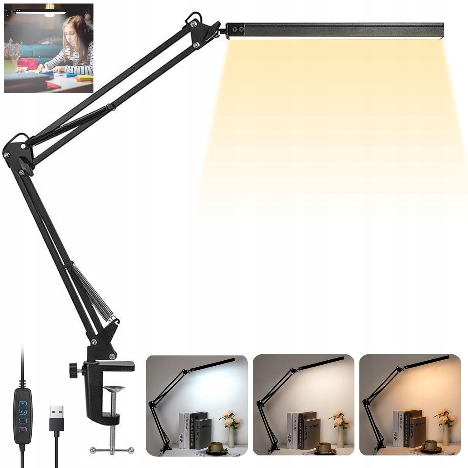 Ця світлодіодна настільна лампа пропонує три колірні температури: теплий (3200 K), теплий білий (4500 K) і білий (6500 K), а також плавне регулювання яскравості. Наша світлодіодна настільна лампа ідеально підходить для роботи, навчання, читання тощо.