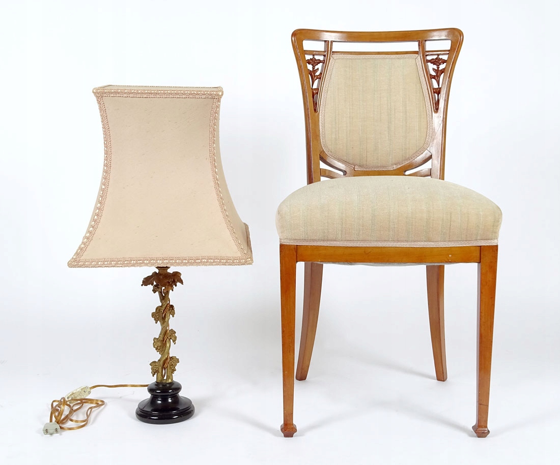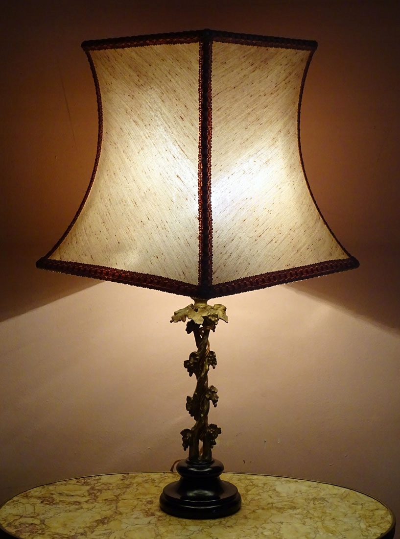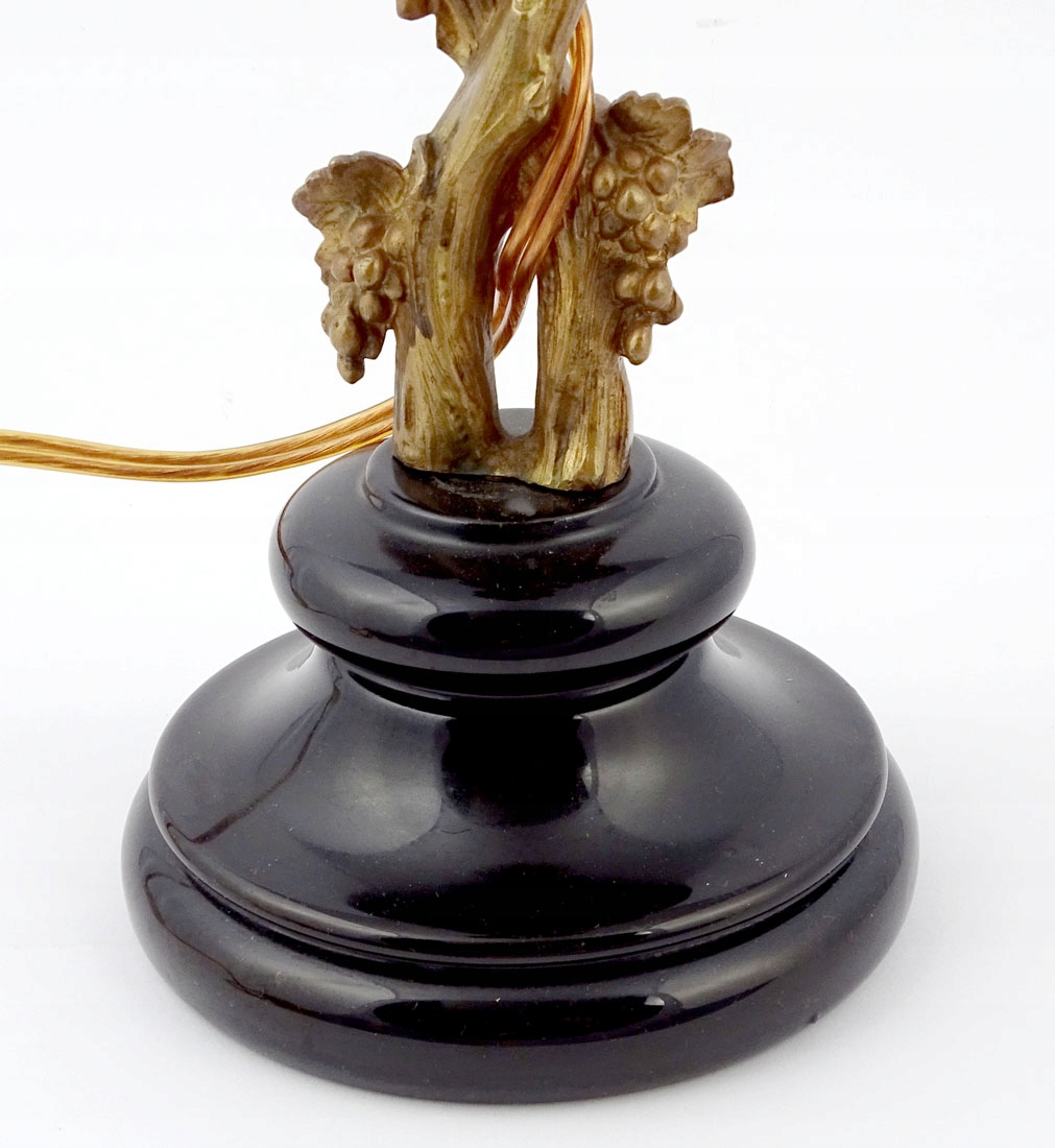 з основою у вигляді звивистих виноградних лоз, листя та фруктів, що тримаються на керамічній, глазурованій, чорній основі, ширшій внизу і звужений посередині. Увінчаний патроном для лампочки, до якого прикріплено сталевий патрон, на якому встановлено абажур із квадратною основою, покритий зверху тканиною.