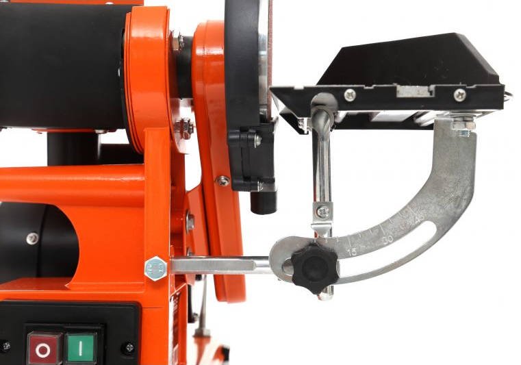 Модуль дискової шліфувальної машини має поворотну стільницю, що дозволяє працювати перпендикулярно диску (в діапазоні 0-45 градусів), а стрічковий стіл може працювати як горизонтально, так і вертикально (в діапазоні 0-90 градусів).