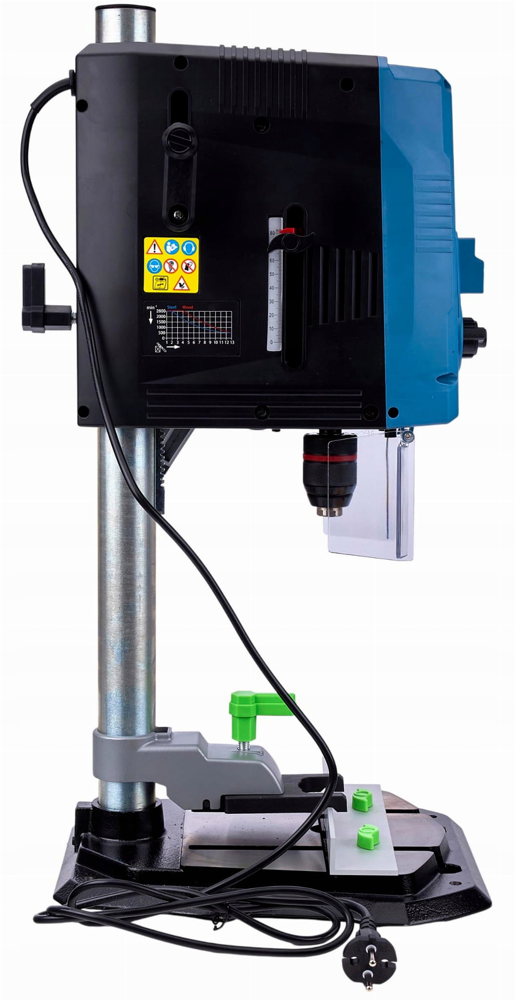 Стійка чавунна конструкція гарантує стійкість до вібрації, а рухливий робочий стіл із регулюванням висоти та кута дозволяє зручно розташувати заготовку. Завдяки ергономічному дизайну, міцним матеріалам і точній роботі дриль є надійним інструментом для вимогливих користувачів.