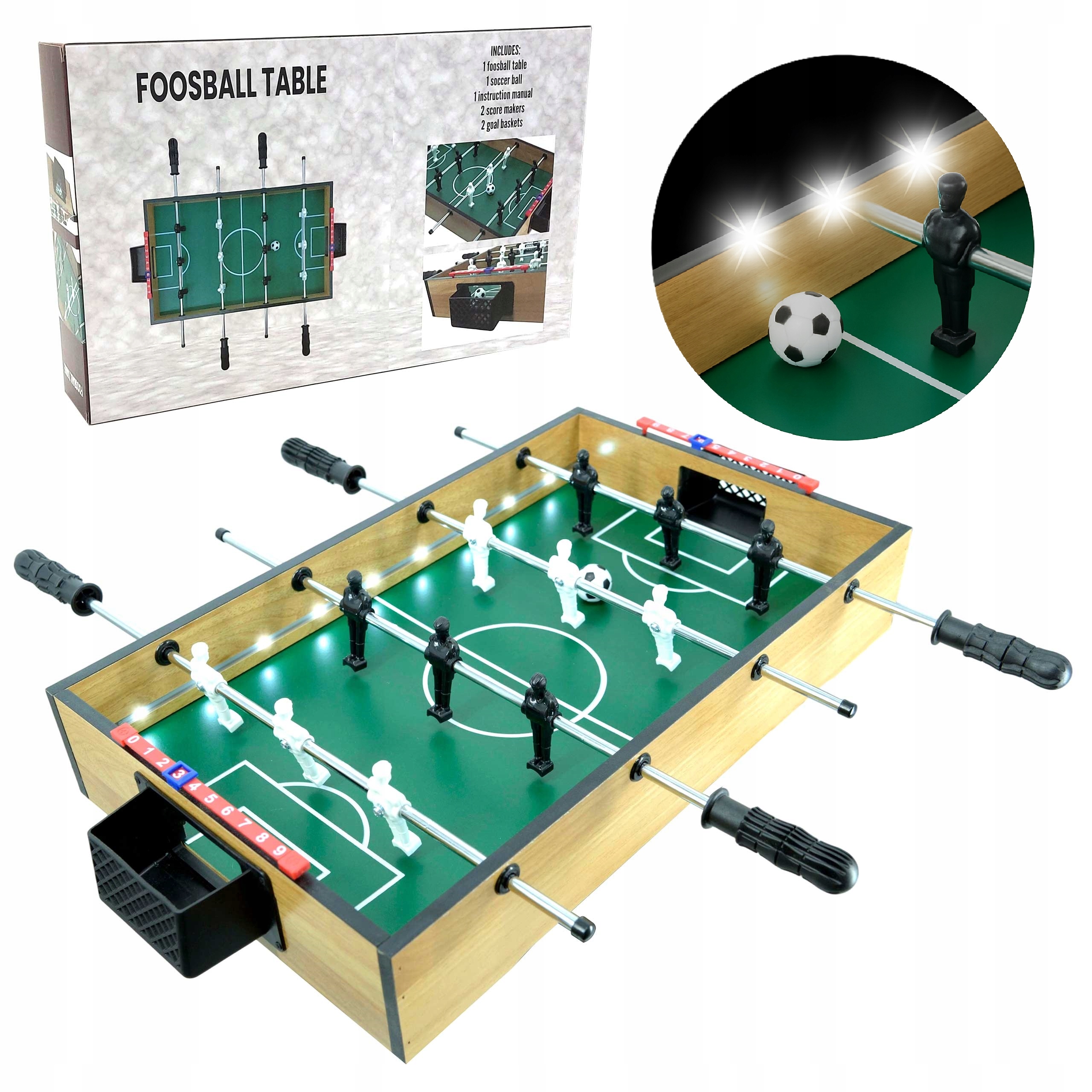 Компактний настільний футбольний стіл зі світлодіодним підсвічуванням! Ідеально підходить для дітей і дорослих, чудовий як подарунок і для домашніх розваг. У набір входить повний стіл з двома командами, м'яч, лічильники голів та інструкція зі складання. Міцна конструкція, зручні ручки та ефективне світлодіодне підсвічування створюють неповторну ігрову атмосферу.