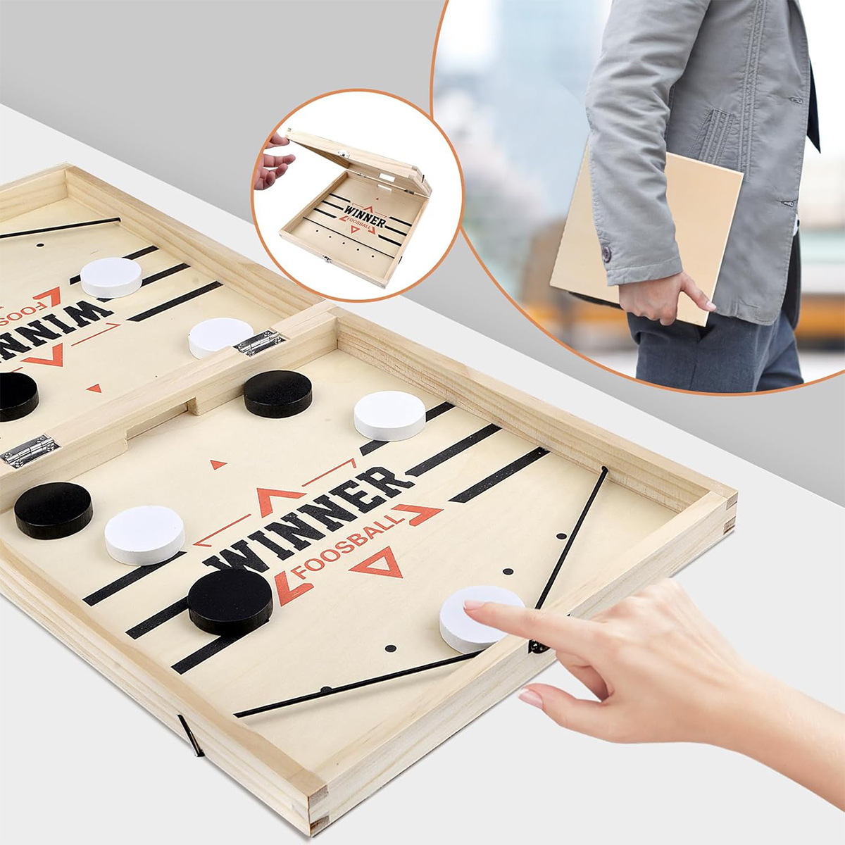 Портативний хокейний стіл 2 в 1 — це динамічна аркадна і стратегічна гра «все в одному». У цій настільній грі кожна сторона має п’ять гравців. Гравець використовує гумку, щоб викидати шайбу з дверей, доки шайби не залишиться. Перемагає той, хто першим очистить дошку.
