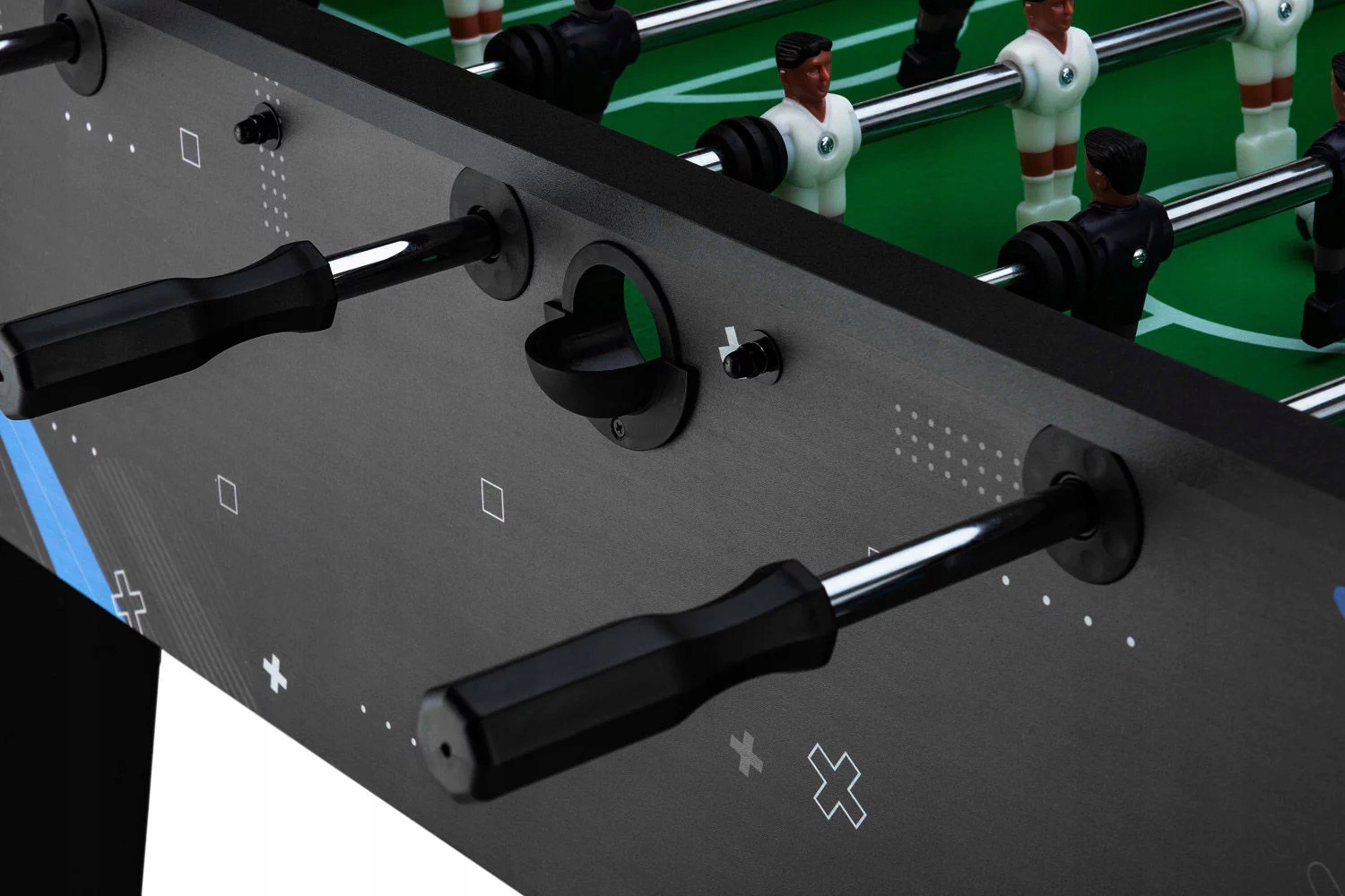 Ширина столу з прибраними та висунутими решітками дозволяє легко пристосуватись до простору у вашому домі, одночасно забезпечуючи комфортну гру для двох людей. Завдяки ручному табло кожна гра стає ще більш захоплюючою, і ви та ваші суперники завжди матимете під контролем поточний результат матчу. Настільний футбольний стіл Alfa Outtec оснащений 22 фігурками гравців, розміщених на твердих телескопічних напрямних, що забезпечує плавність і точність рухів. Висота фігурок була ідеально підібрана, щоб забезпечити реалістичні враження від гри. Додатково в набір входять два м'ячі, які завдяки своєму діаметру ідеально підходять для динамічної та швидкої гри.