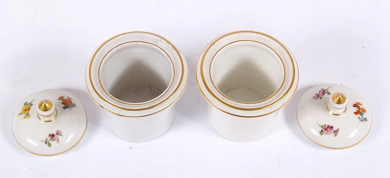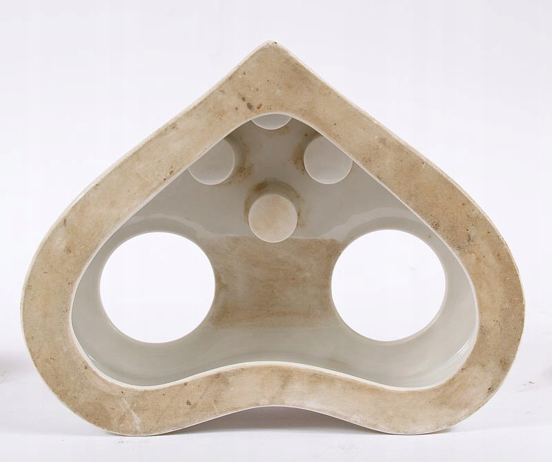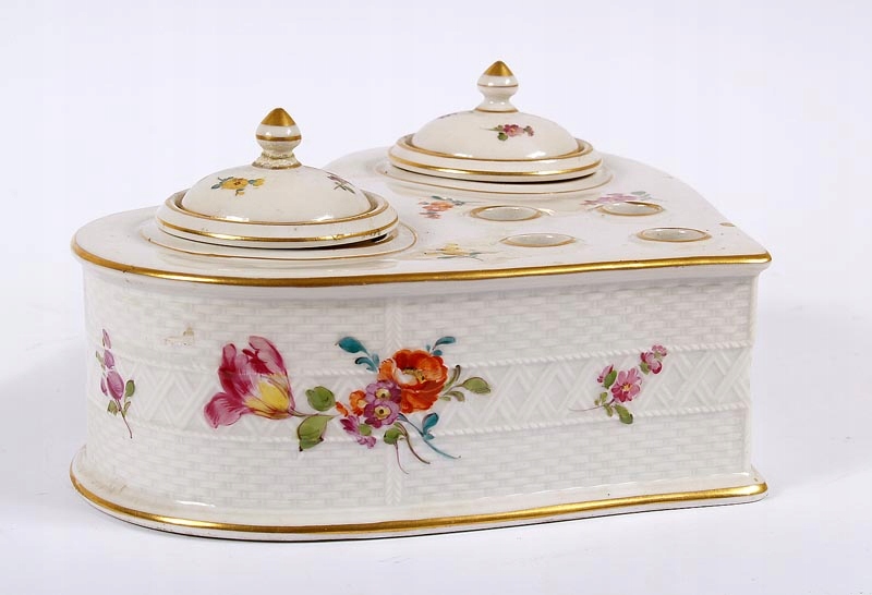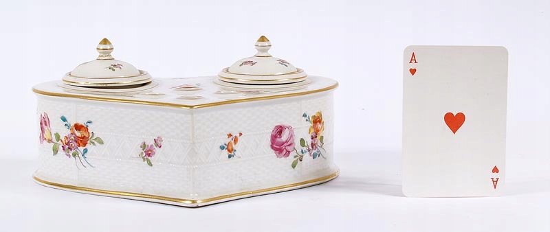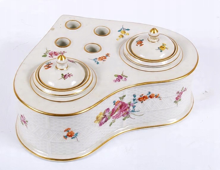 у формі серця, з двома ємностями (для чорнила та піску), з чотирма отворами для ручок. У корпусі з плоским дном, в отвори якого вставлені ємності з кришками. Верх плоский, з боків рельєфна тасьма. По всій поверхні намальовані квіти та квіткові букети. Підпис на нижній стороні, підглазурне покриття кобальтом, із символом вулика та коричневою надглазурною літерою «s».