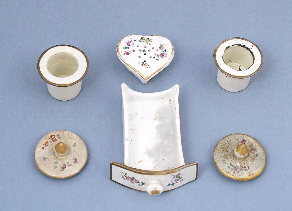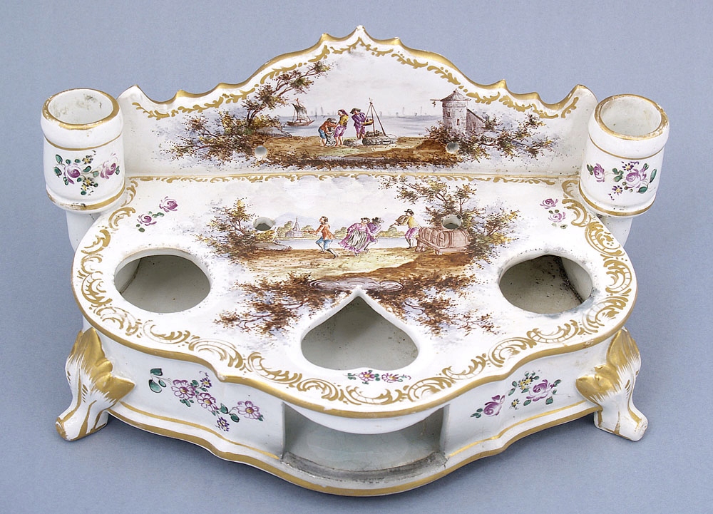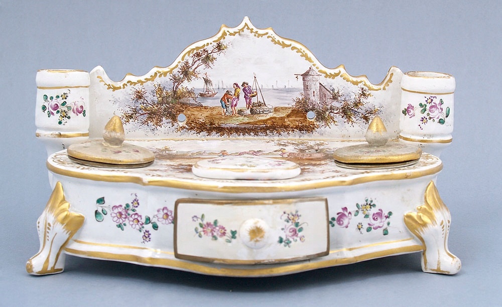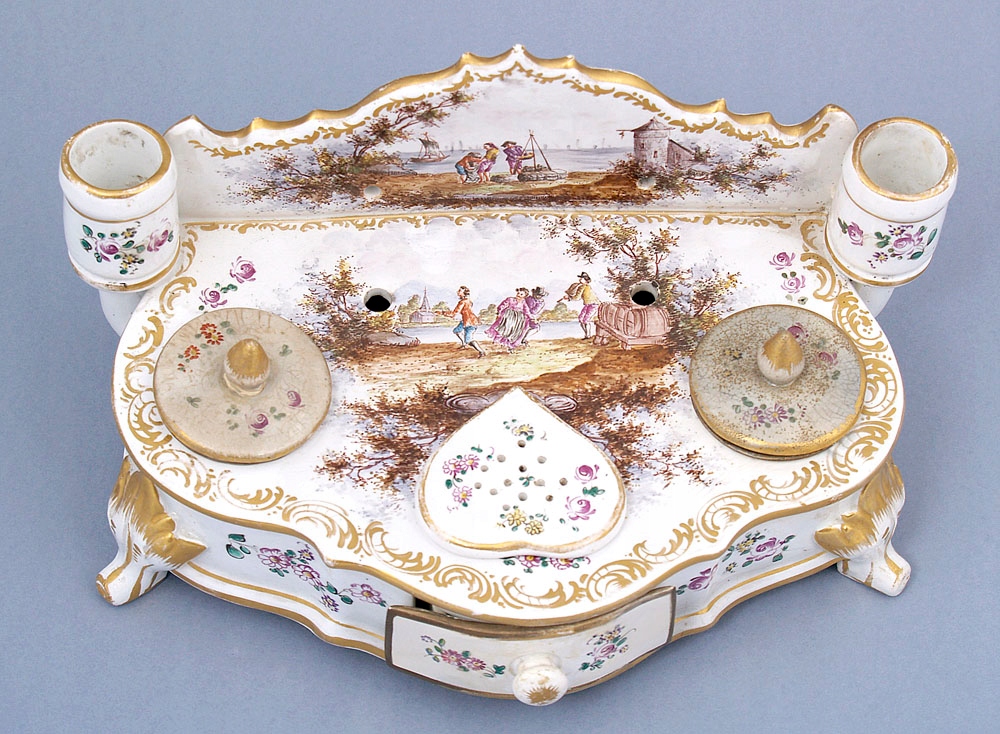 у вигляді декоративної печі, профільованих форм, спирається на чотири ніжки, у формі листа спереду, циліндричної ззаду. Дві ємності з кришками з боків, одна пізніше зроблена з латуні, шухляда посередині, ємність у формі серця над нею та ємності для ручок або свічок зовні. Усе це пофарбоване золотом по краях, із квітами та двома романтичними сценами.