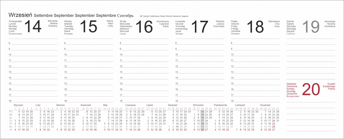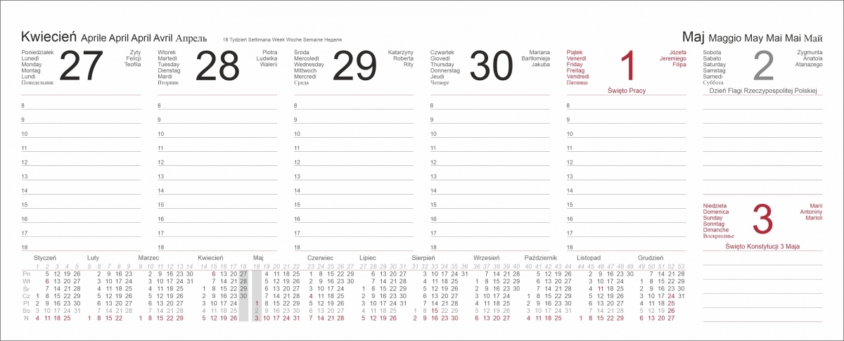 - назви місяців і днів тижня польською, італійською, англійською, німецькою, французькою та російською мовами