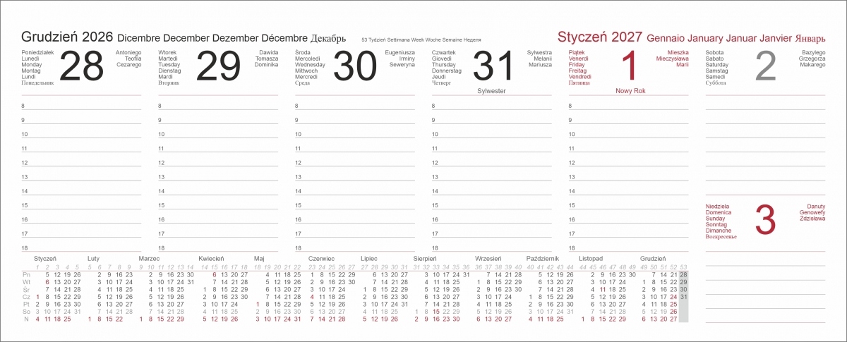 Крім того, календар містить іменини, державні та релігійні свята, торгові неділі та окремі особливі свята. На початку календаря міститься чіткий план на весь 2025, 2026 та 2027 рік.